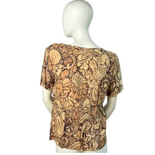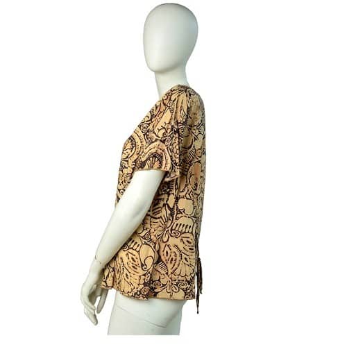 Short blouse in woven fabric with a leopard print pattern. V-neck and drawstring at front with narrow, v-neck neckline at the back and short puff sleeves covered elastic at cuffs.
