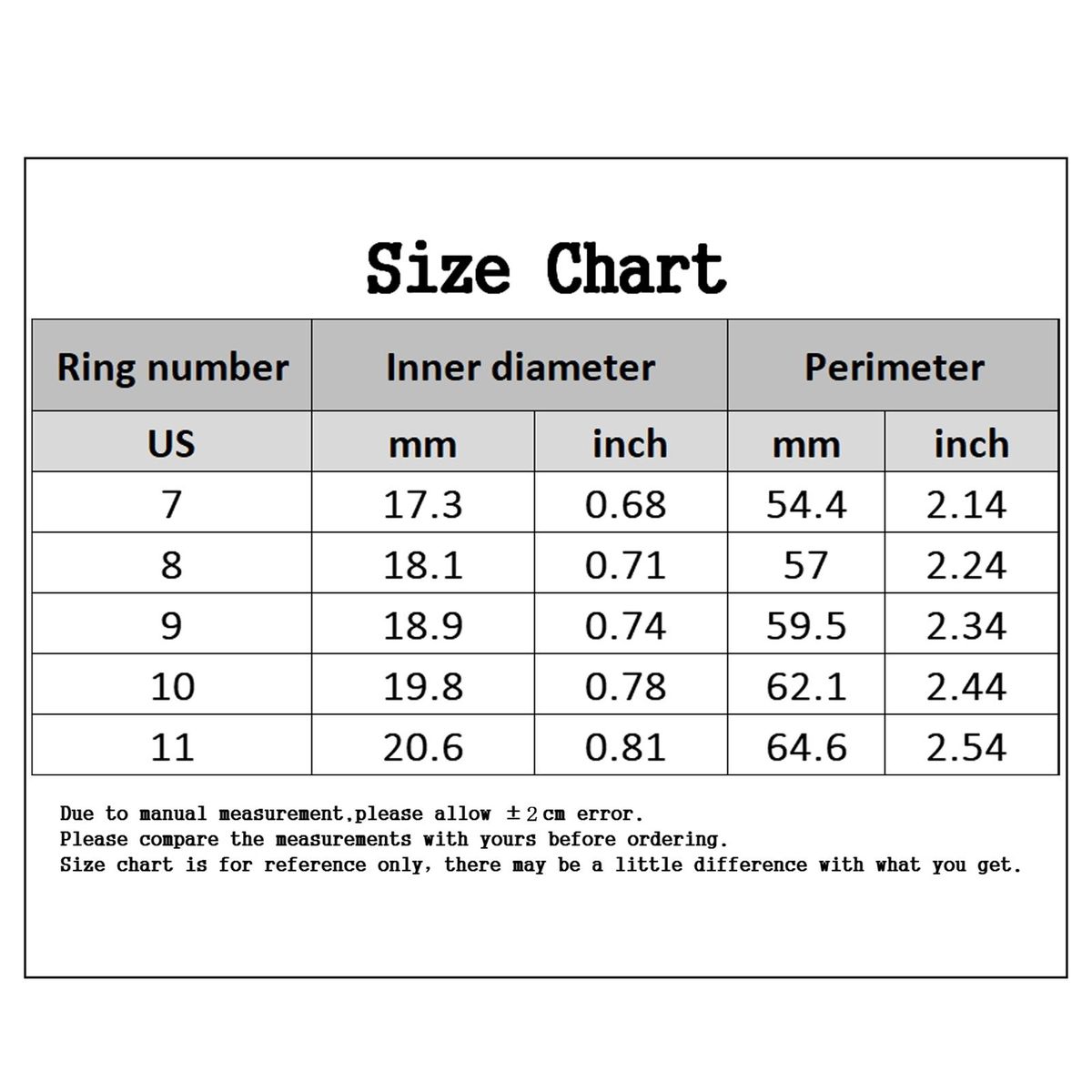 Size: US 11, Inner Diameter: 2.06cm/0.8", Perimeter: 6.46cm/2.5" (Approx.)