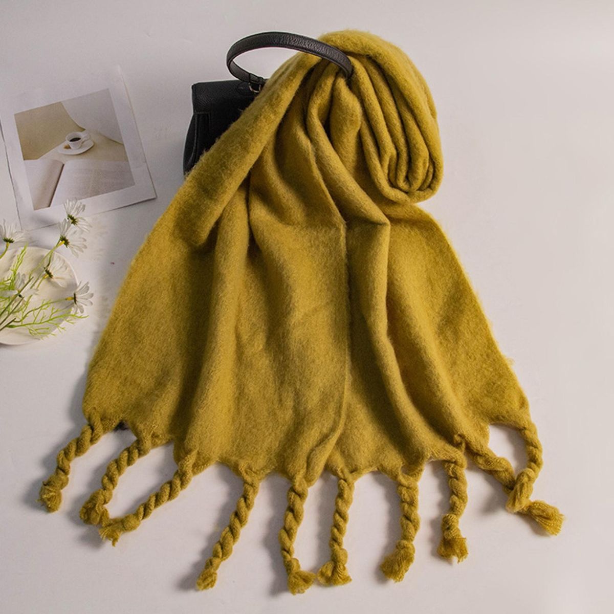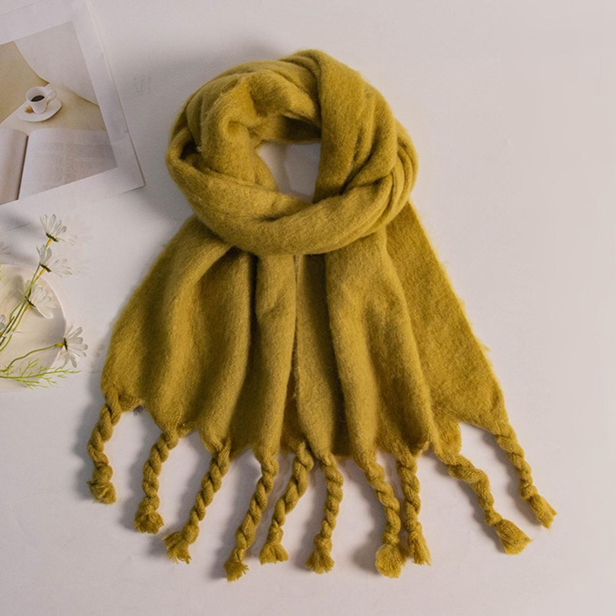 Featuring braided tassels and bright color, this scarf is very fashionable, popular and eye-catching, which makes you look more temperament and charming.