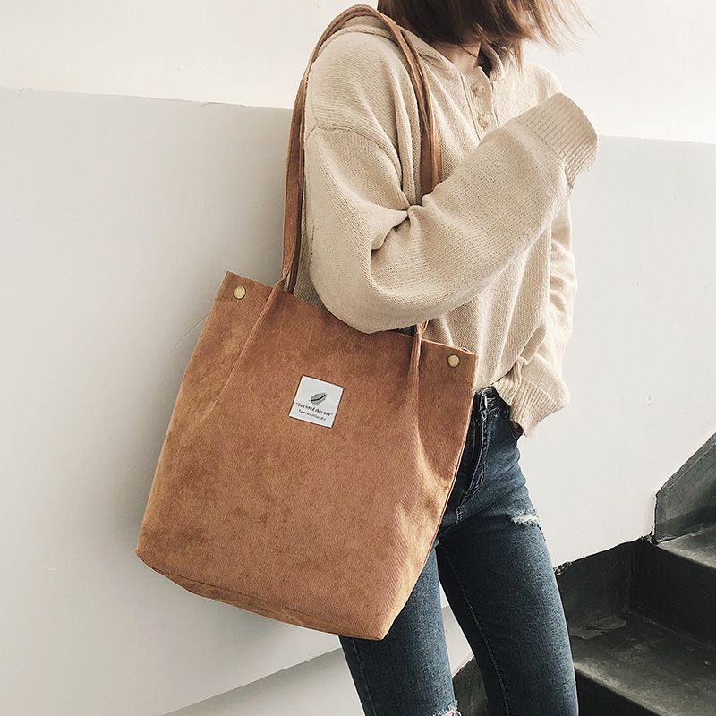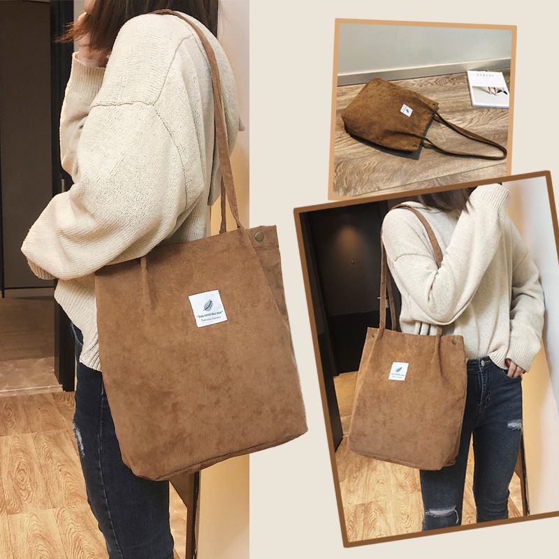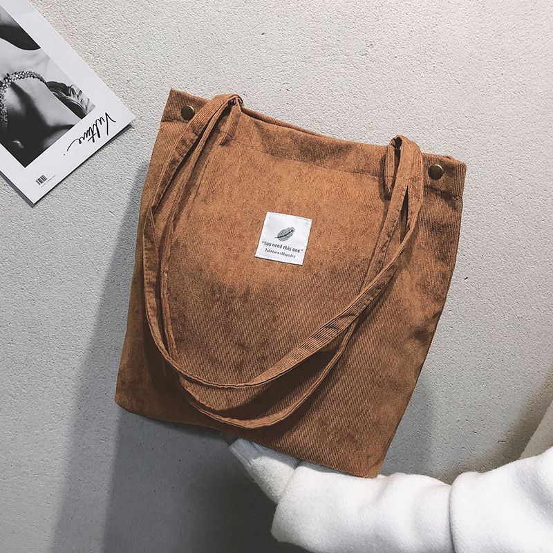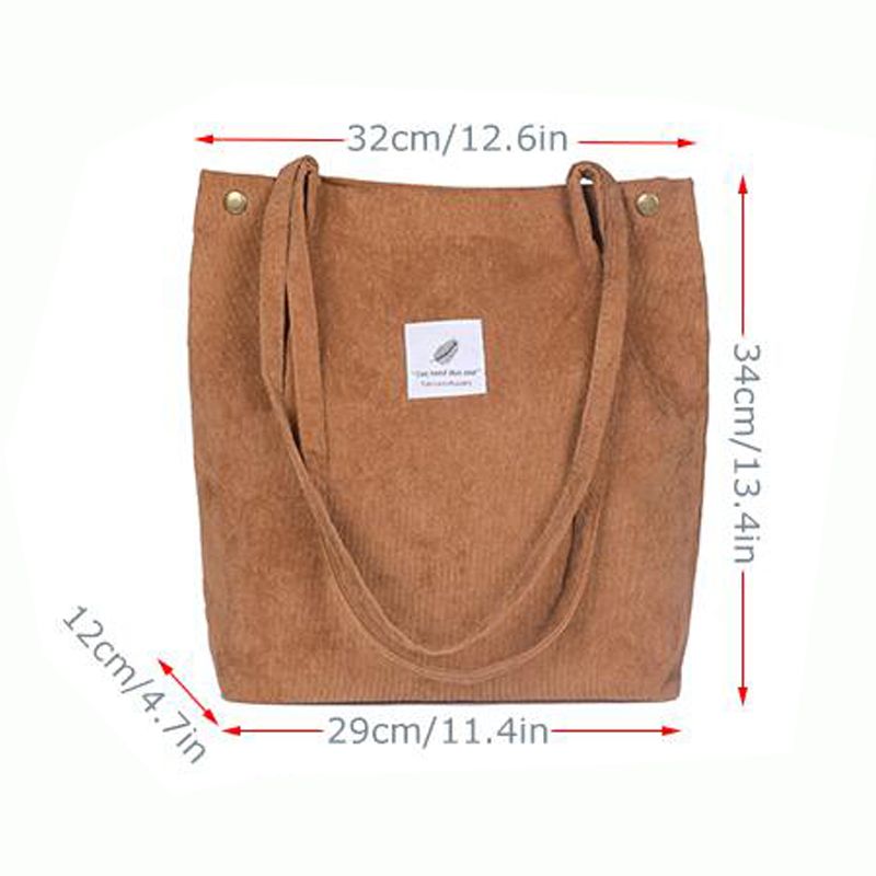 Vintage corduroy tote to complete your chic ensemble. It has retro solid corduroy finish, magnetic stud and press studs closure to top, and interior slot pocket. It is soft, foldable, light and reusable. Have it to pair your corduroy skirt, coat or jeans for school, shopping, or holiday.