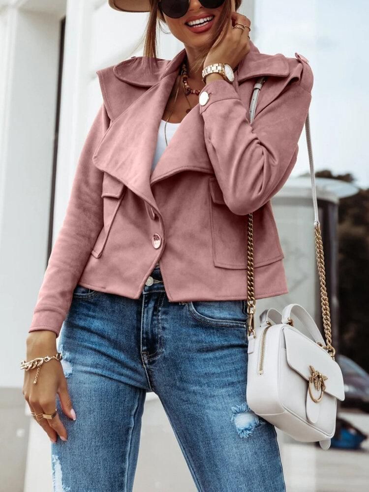 Buy Women Solid Faux Suede Button Up Lapel Casual Long Sleeve Jacket With Pocket in Nigeria