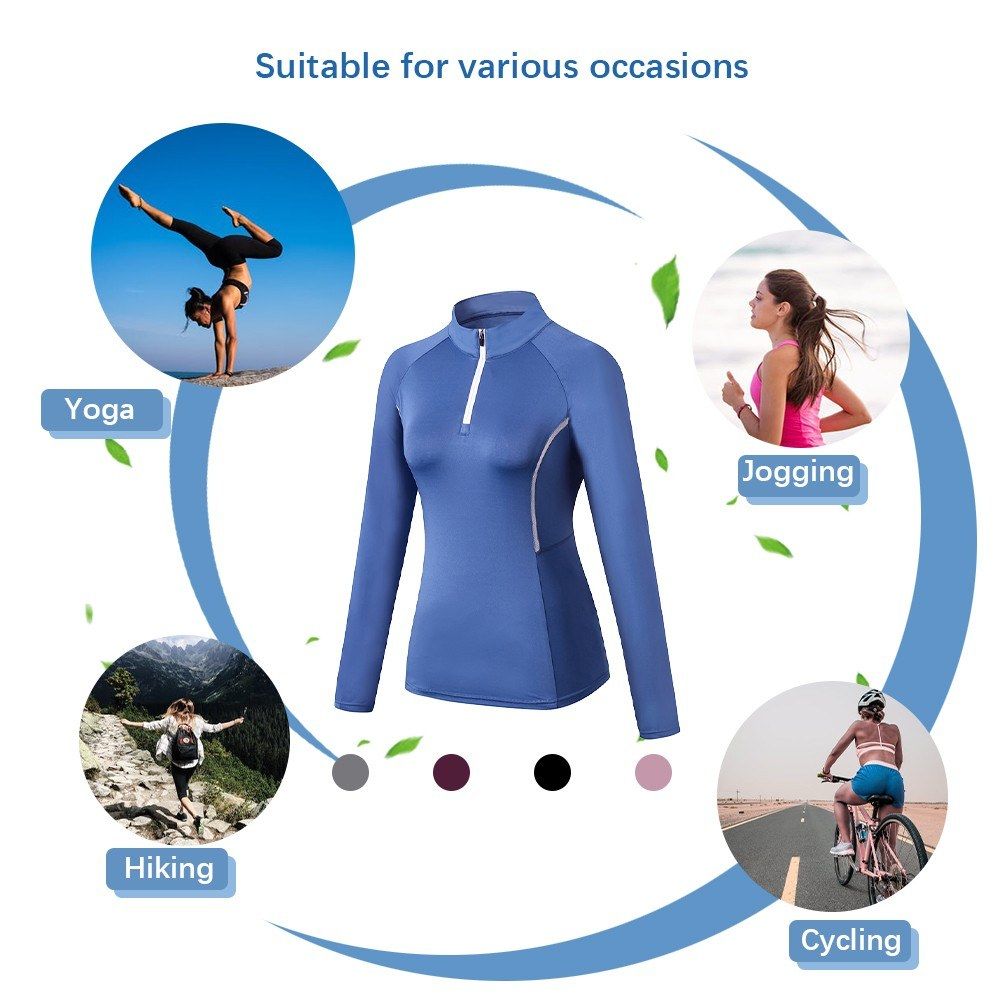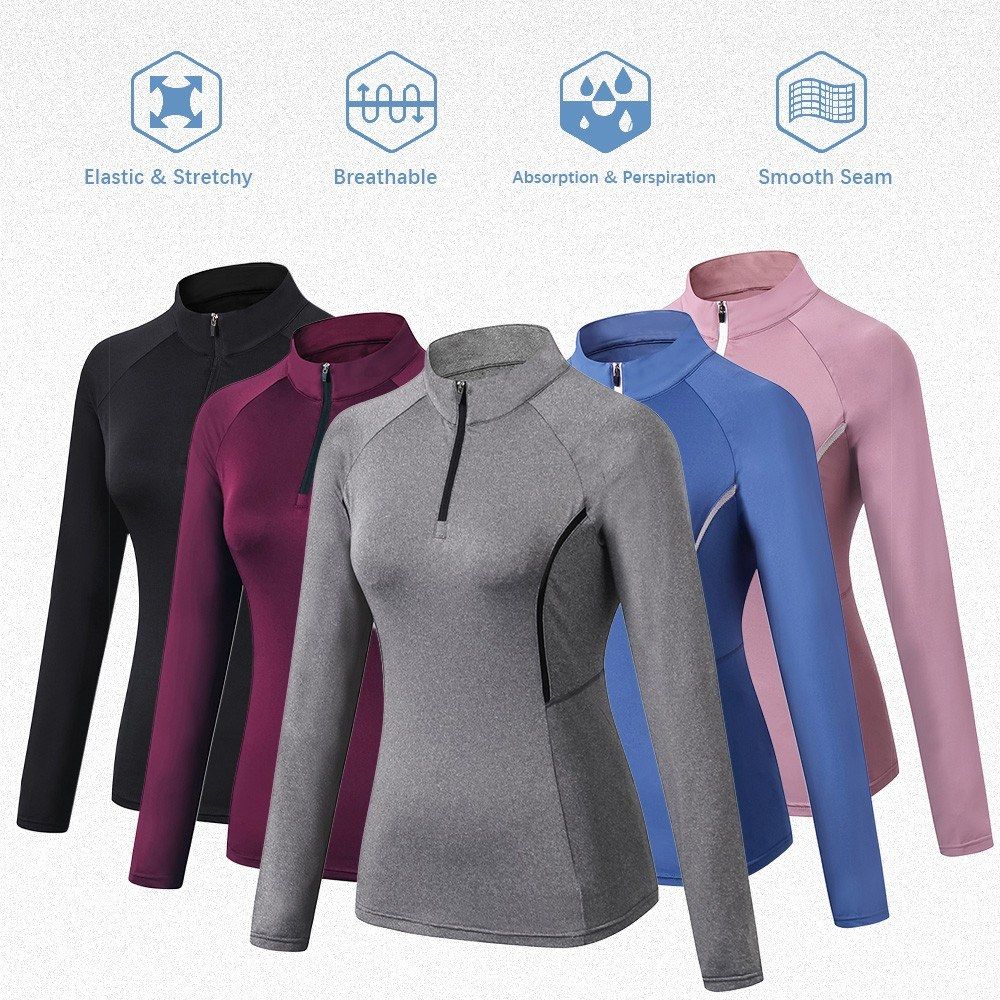 Women yoga sweatshirt features stand collar, long sleeves, zipper and quick-dry details. With slim fit and stretchy design, it is very comfortable and flexible to exercise in this outfit.