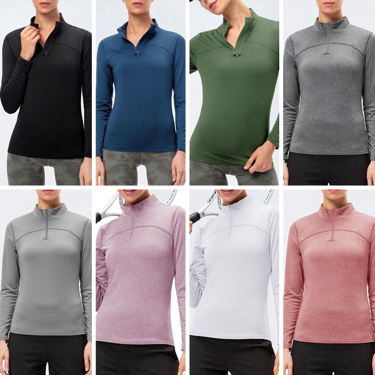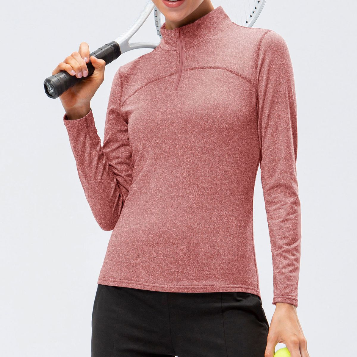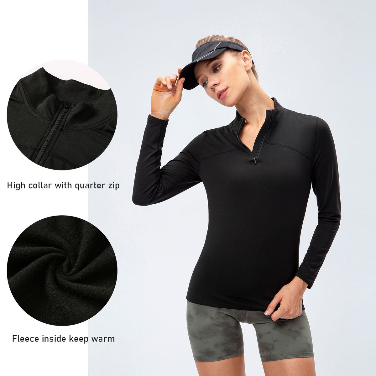 Slim shirt with fleece inside for cold weather. It features high collar with quarter zip, long sleeves and tight fit. Pair it with leggings and outdoor coat for running, hiking, climbing, tennis, etc.