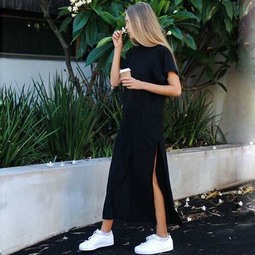 Women Summer Cotton Long Plus Size Sexy Side Slit Casual Maxi T-Shirt Dre Girls O-Neck Short Sleeve Slim Black Beach Maxiskirt
