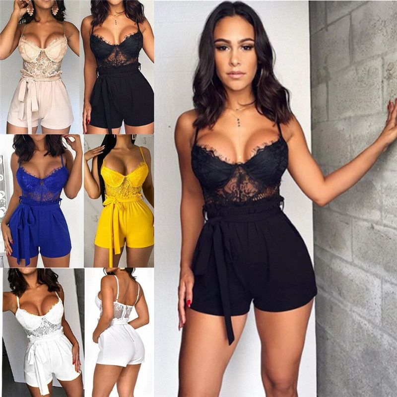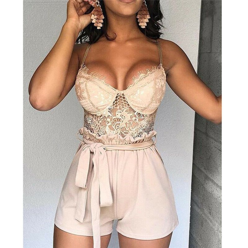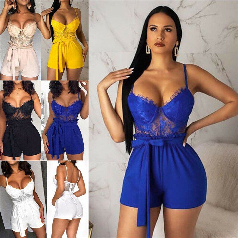1X Women Summer Lace Camisole V Neck Sleeveless Playsuit Holiday Strap Mini Playsuit Sexy Shorts Jumpsuit Club Clothes