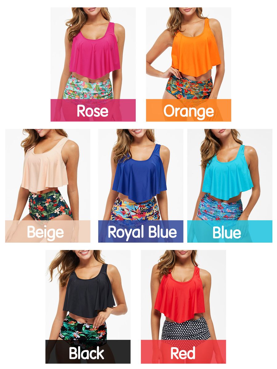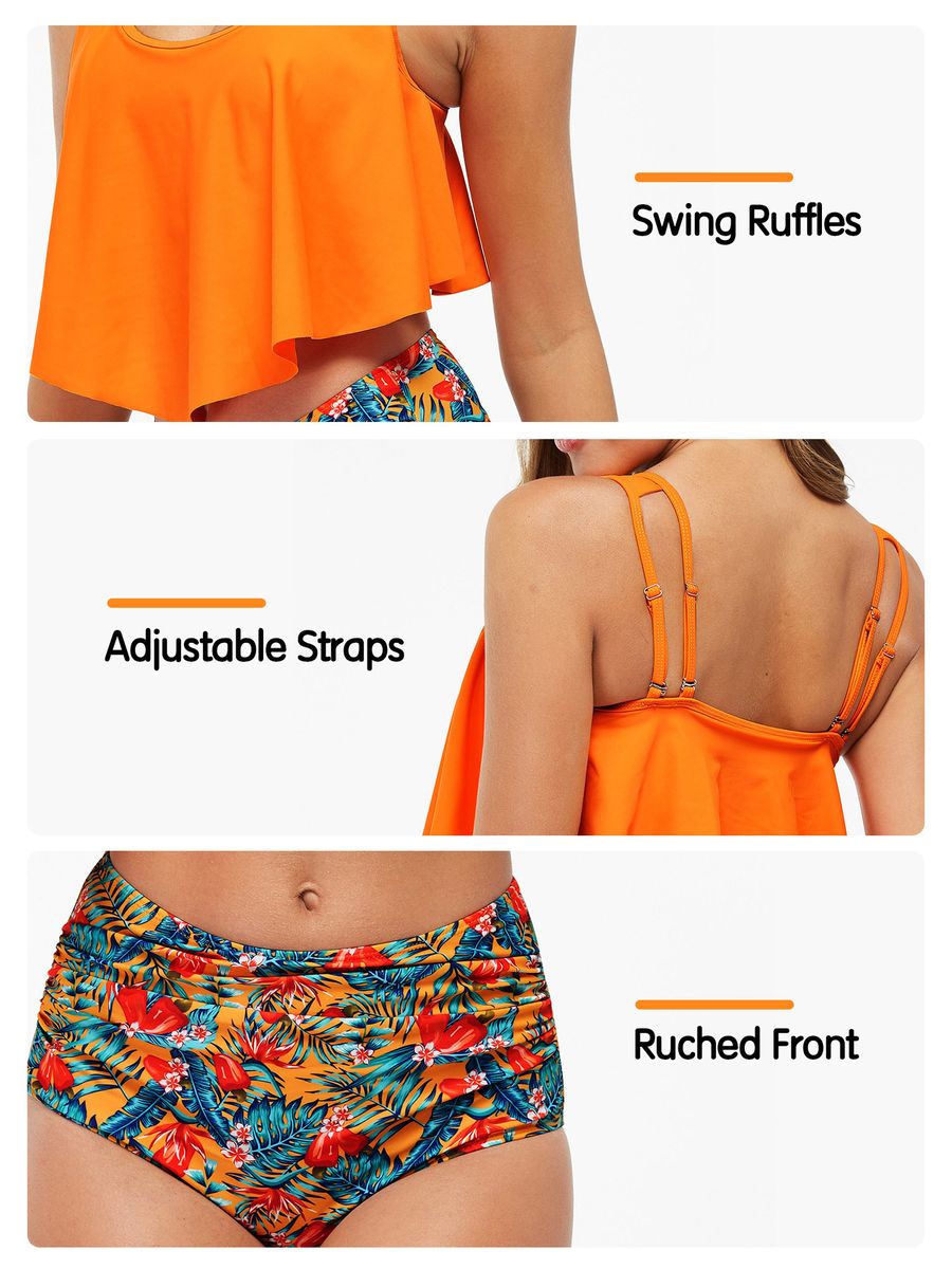 Two pieces swimsuit consist of a solid bra and printed shorts. Padded no-underwire top with adjustable straps and ruffles allows a comfortable fit and shows your sexy curves. Shorts designed with high waist and ruched detailing visually elongate your legs and cover the belly fat. Have it for the holiday, pool, or beachside.