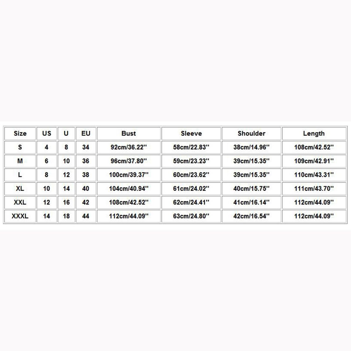 Size: XXXL US: 14 U: 18 EU: 44 Bust: 112cm/44.09'' Sleeve: 63cm/24.80'' Shoulder: 42cm/16.54'' Length: 112cm/44.09''