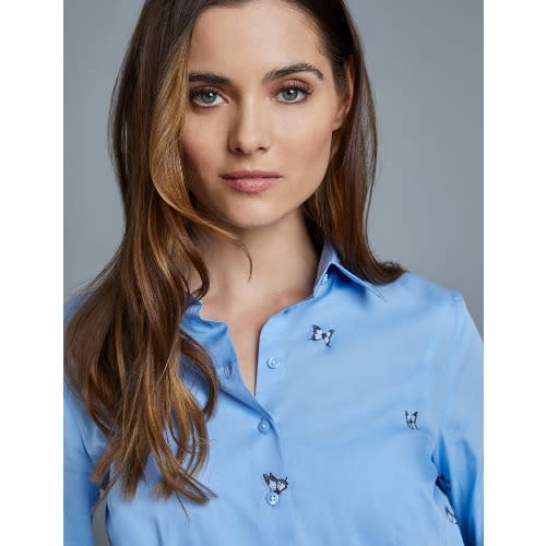 This women's stylish blue fitted shirt features a butterfly design and an elegant pointed collar and single cuffs. Our fitted shirts have been flatteringly designed with darts at the waist and bust, creating a streamlined silhouette. This shirt is made from 100% quality cotton, which feels extremely comfortable and soft.