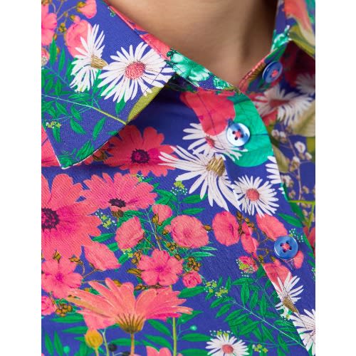 This women's blue and yellow floral print cotton stretch fitted shirt is designed with an elegant single button collar and single cuffs. It is crafted from high quality cotton stretch fabric which stops the shirt from feeling restricting. Finer details include fuss-free single cuffs and a contrasting trim inside the collar. Our fitted shirts have been flatteringly designed with darts at the waist and bust, creating a streamlined silhouette.