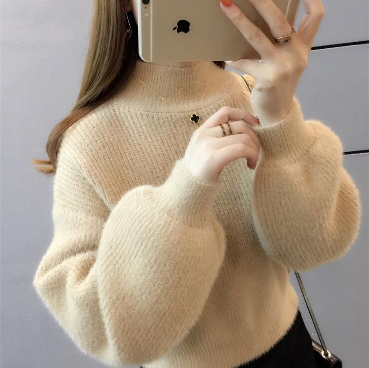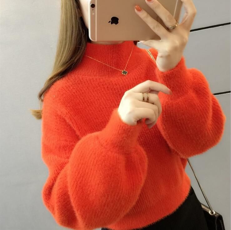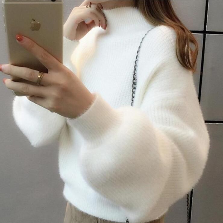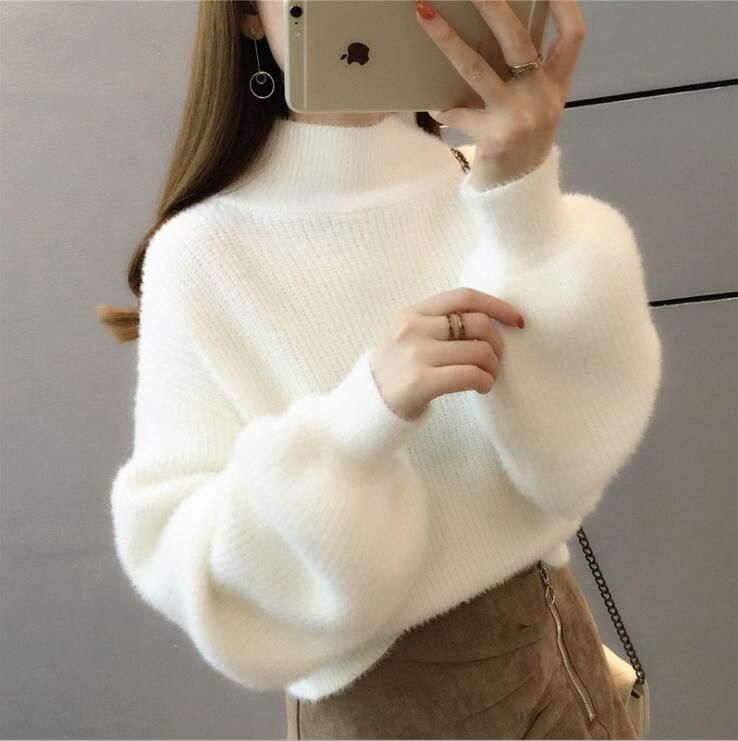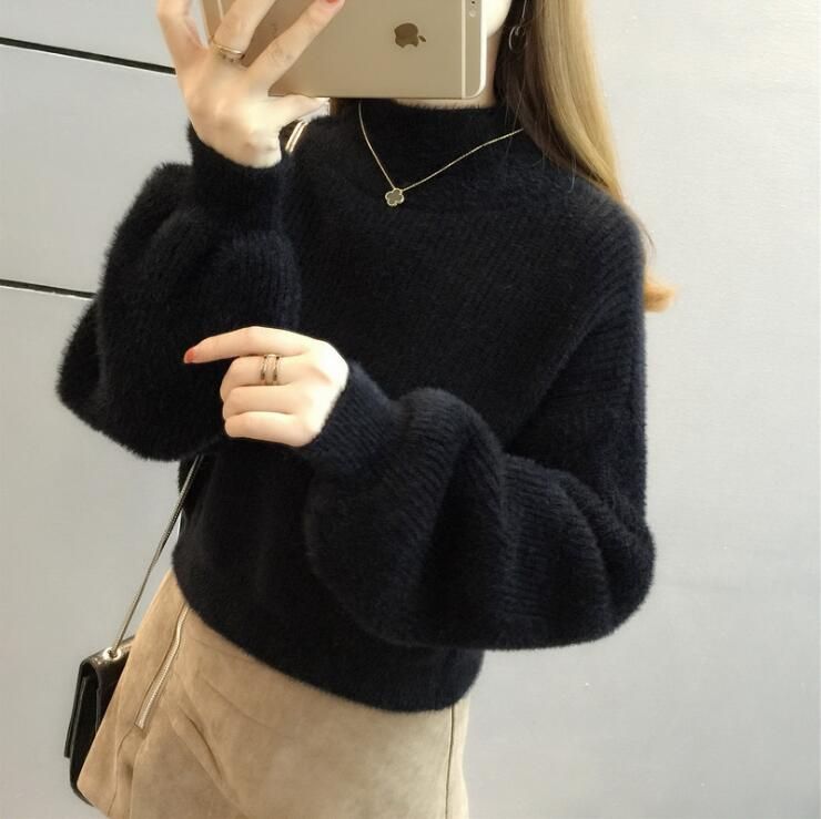 1X Women's Casual Mink Cashmere Turtleneck Lantern Sleeve Crop Sweater Loose Knitted Purple Pullover Oversize Jumper Tops New Q9238