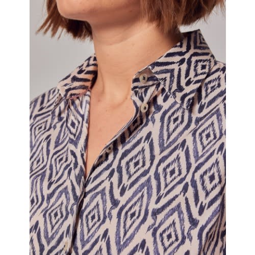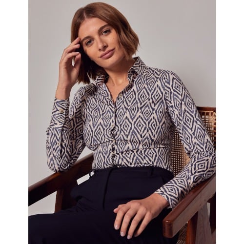 Buy Women's Cream & Blue Geometric Fitted Cotton Stretch Shirt in Nigeria