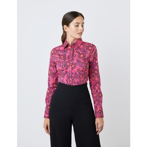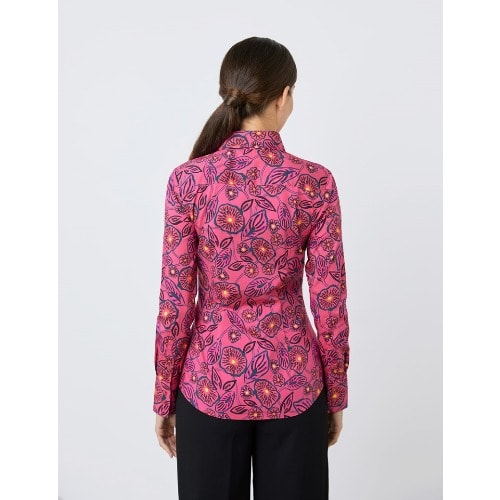 This women's blue and yellow floral print cotton stretch fitted shirt is designed with an elegant single button collar and single cuffs. It is crafted from high quality cotton stretch fabric which stops the shirt from feeling restricting. Finer details include fuss-free single cuffs and a contrasting trim inside the collar. Our fitted shirts have been flatteringly designed with darts at the waist and bust, creating a streamlined silhouette.