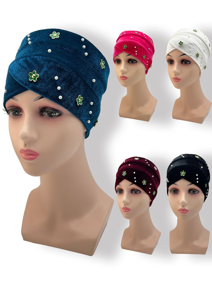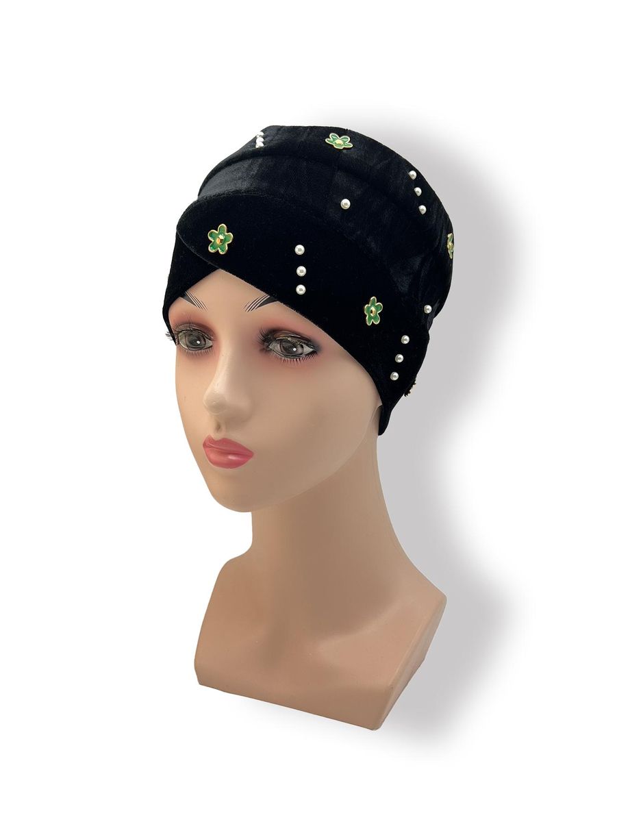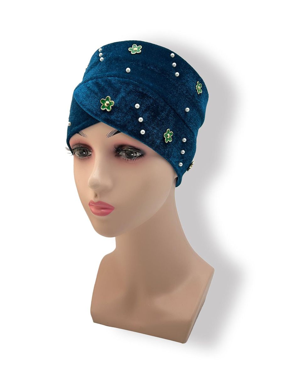 1X Women'S Hijab Fashion Muslim Hair Accessories Korean Version Velvet Green Small Flower Diamond And Faux Pearl Hijab Hat Headdres