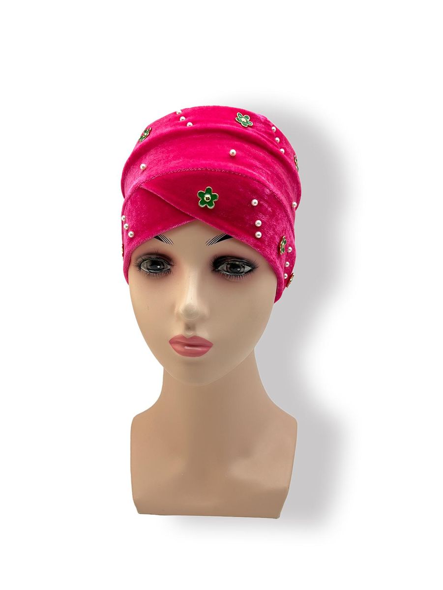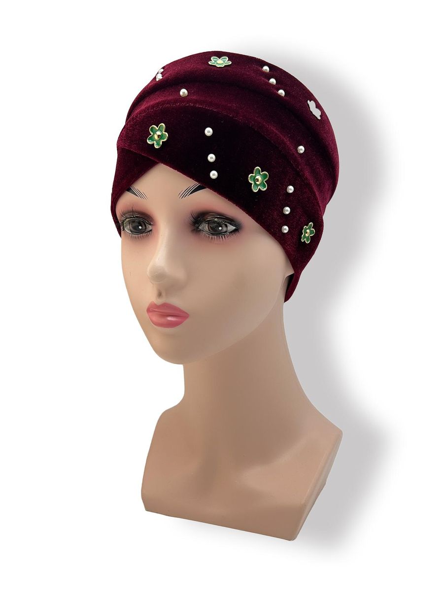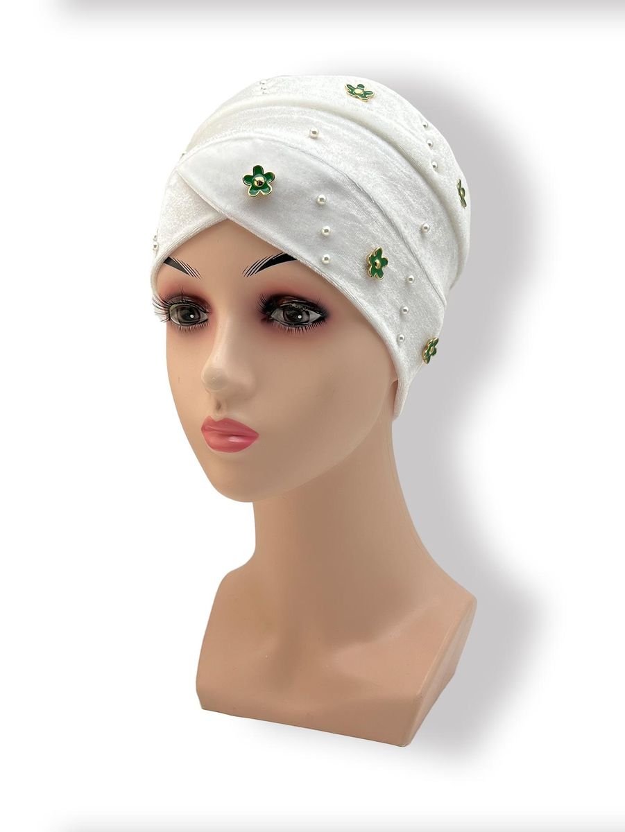 1X Women'S Hijab Fashion Muslim Hair Accessories Korean Version Velvet Green Small Flower Diamond And Faux Pearl Hijab Hat Headdres