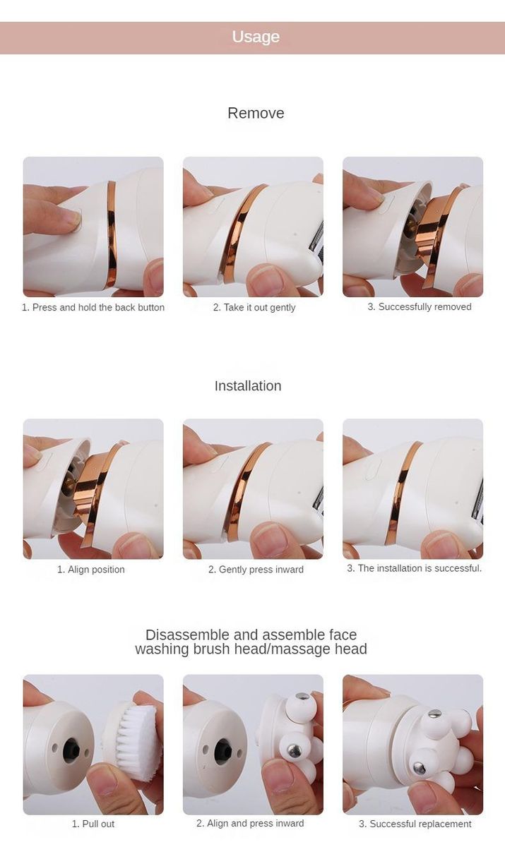 1. Ergonomic design, easy to hold handle, multi-purpose machine (massage head, shaving head, cleansing brush)