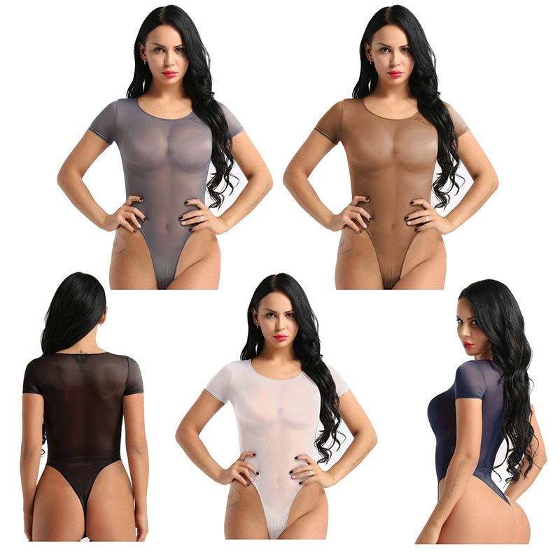 1X Womens One Piece Mesh See Through Sheer Teddy Short Sleeve High Cut Bodysuit Romper Bikini Thongs Swimsuit Jumpsuit