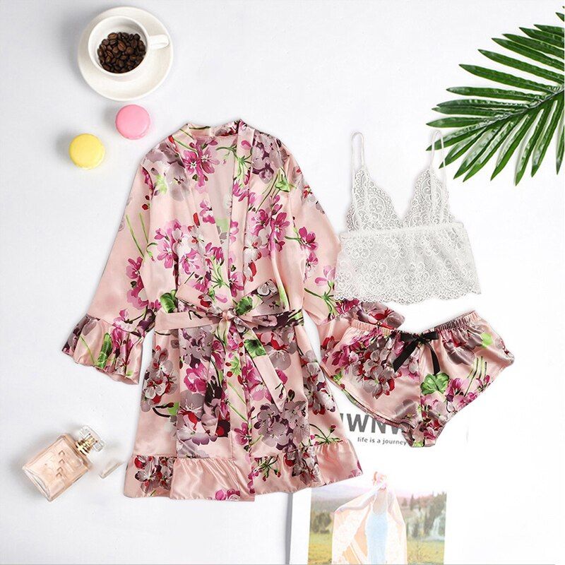Material:Polyester.Super soft and comfortable fabric crafted.Durable enough for you daily wearingColor - 2 Colors Available.As The Photo(solid)Quantity: 1 PCPackage Include: 1x Women's Pajamas SetSelling points:Material: Polyester. Skin-friendly, air permeability and absorbent.is pajama sets for women will keep you easeful while sleeping at night, that's ultra smooth against the skin so you can enjoy superior comfortFeatures: Sleepwear set, includes camisole, shorts, and a night robe.Design: Many individual color and patterns with lace makes the sleepwear sexy, and the light color looks very fashion and deep color look mature.Occasions: The nightwear is great for your wife,