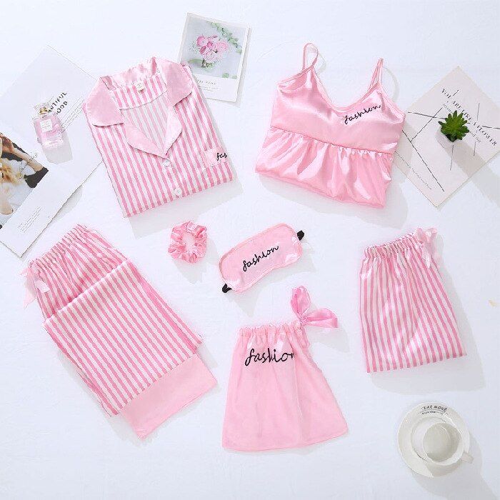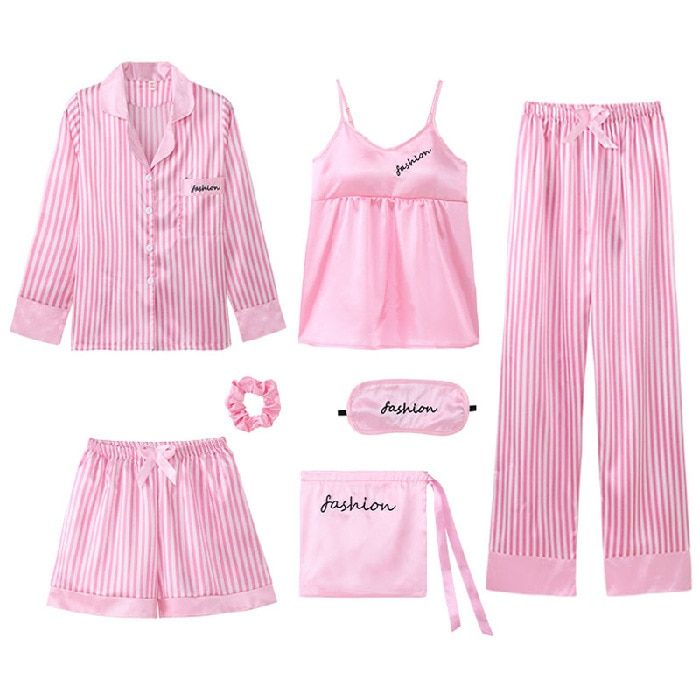 1X Women's pajamas 7PCS Sleepwear Spring Long Sleeve Ice Silk Pijamas