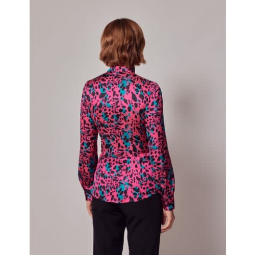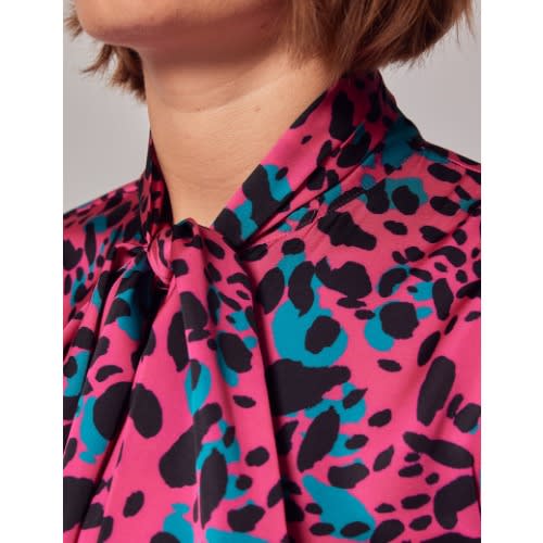 Overszied female blouse in silk floral print fabric, v-shaped opening at front, long, raglan ballon sleeves with elasticized cuffs and elastic at the back.