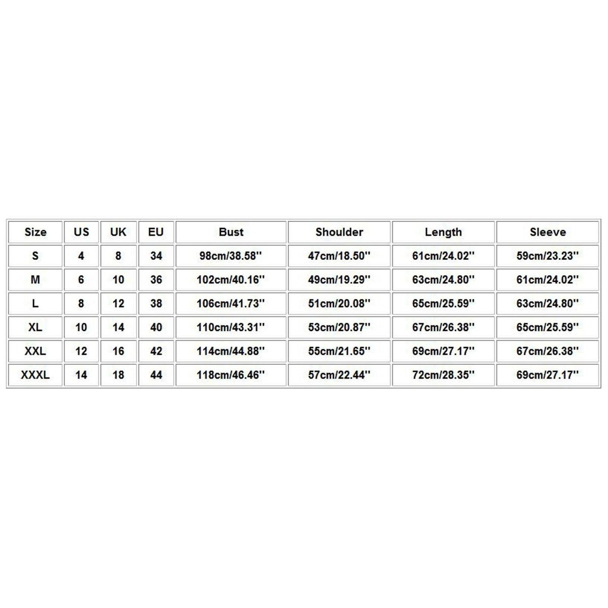 Size: XXXL US: 14 UK: 18 EU: 44 Bust: 118cm/46.46'' Shoulder: 57cm/22.44'' Length: 72cm/28.35'' Sleeve: 69cm/27.17''