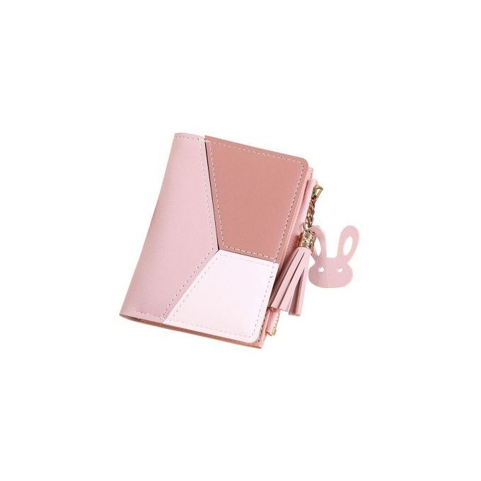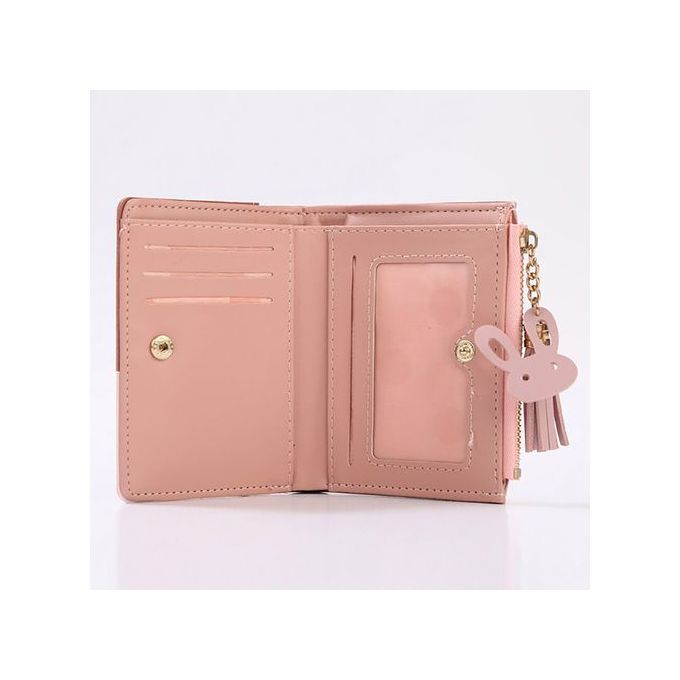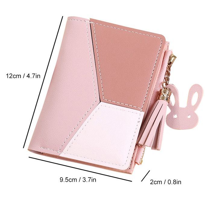 Short wallet with splicing design features 5 card holders, 1 photo holder and 1 note compartment, which is quite a large capacity given its size. Also, it has this delicate tassel and rabbit decoration.