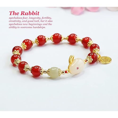Elegant Agate Rabbit Bracelet Feng Shui Amulet for Women Spiritual Healing, Lucky Charms for 2023-Spiritual Meaning Of Rabbit The bringer of good luck & ndash; rabbits bring good luck, fortune and abundance. Therefore, their appearance in your life might be a sign that good luck and fortune are coming your way.Meaning & Energy: Agate is a gemstone that has the meaning and properties of regaining a sense of youth. It evokes the "power of idea" and "curiosity" you felt when you were a boy or girl. Please try the power of Red Agate when you are too conservative. Agate includes yin and yang energy, providing a balance between the positive and negative. In fact, one could collect only agate stone varieties and accrue all the crystals one would need for healing the body and mind.In Chinese folklore, the rabbit often is portrayed as a companion of the Moon goddess Chang'e, constantly pounding the elixir of life for her and some show the making of cakes or rice cakes. The Moon Rabbit or Moon Hare is a mythical figure in East Asian and indigenous American folklore who lives on the Moon, based on pareidolia interpretations that identify the dark markings on the near side of the Moon as a rabbit or hare.Suitable Wrist Circumference Materials: hand-selected agate, white jade, Hetian nephrite jade, etc. The stones are selected by artsians with more than seven years experience in jewelry making, rinsed and polished by hands. Our jewelry artworks are directly from our studio, using many royal jewelry making techniques. Affordable work of art, yet highly collectible.Meditation Oranment that Works: Our metaphysical products are cleansed and blessed by eminent monks, the benediction comes after you placing the order, to ensure the power of the ornament is stronger. Great Feng Shui service, does the magic! NOTE: there might be ice cracks, trails of minerals and organic matters, or flocs, they are the characteristics of natural gemstone, please keep in mind.