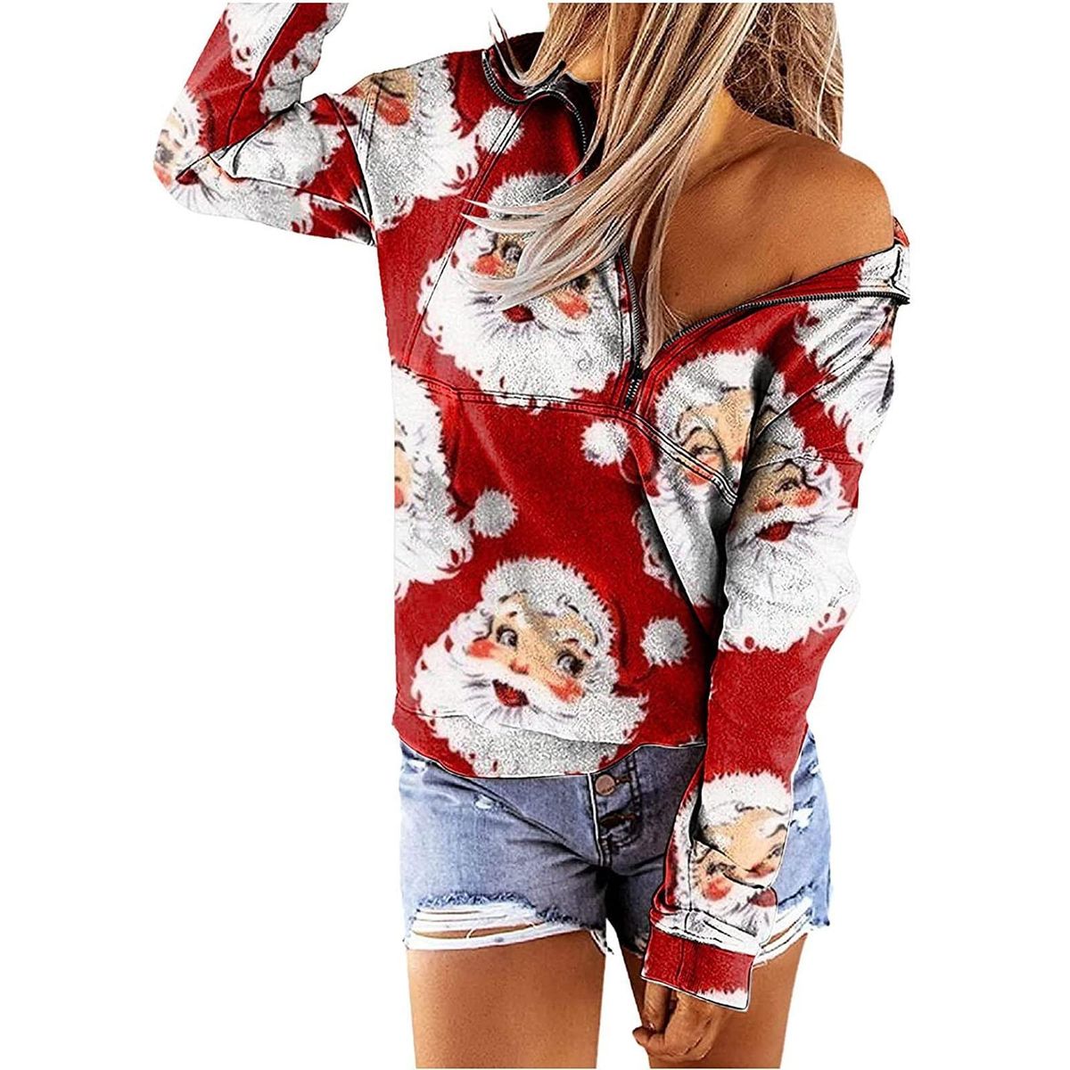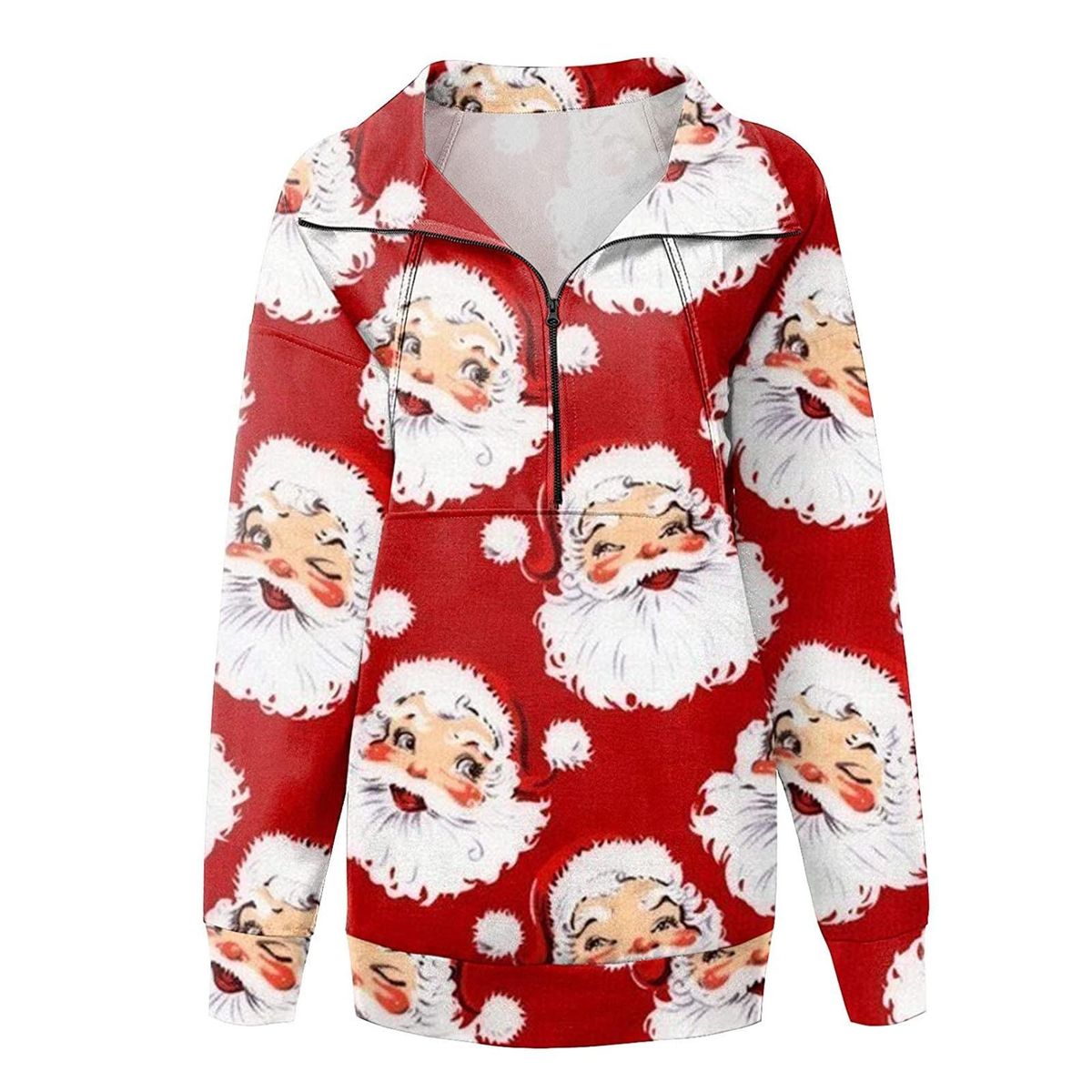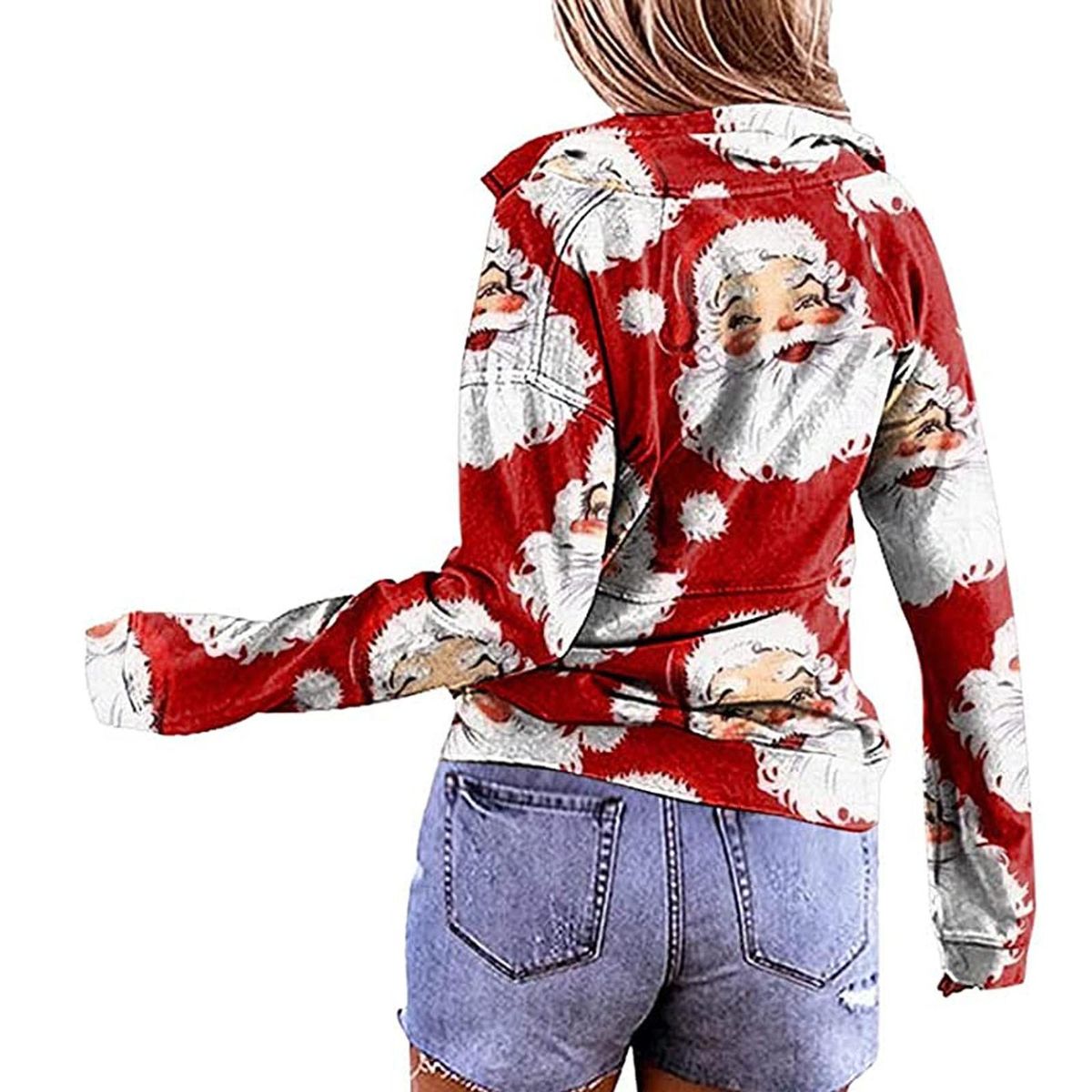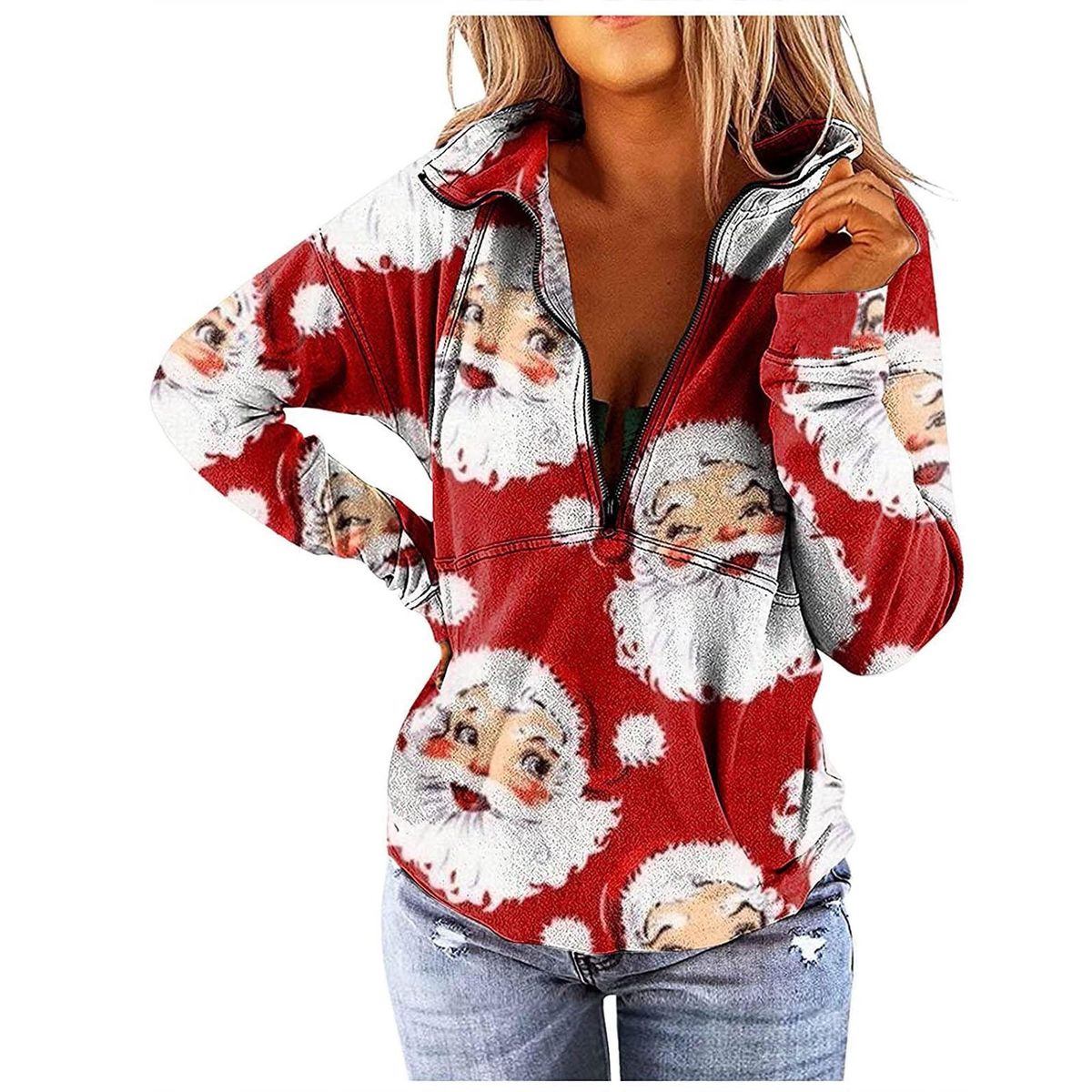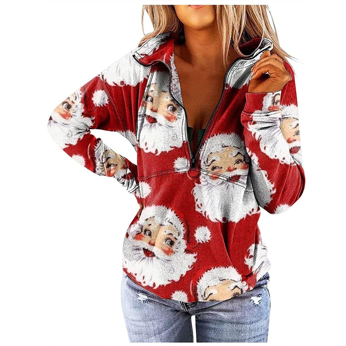 Women's V-Neck Zipper Christmas Print Long-sleeved Sweatshirt Casual Blouse Pullover Tops