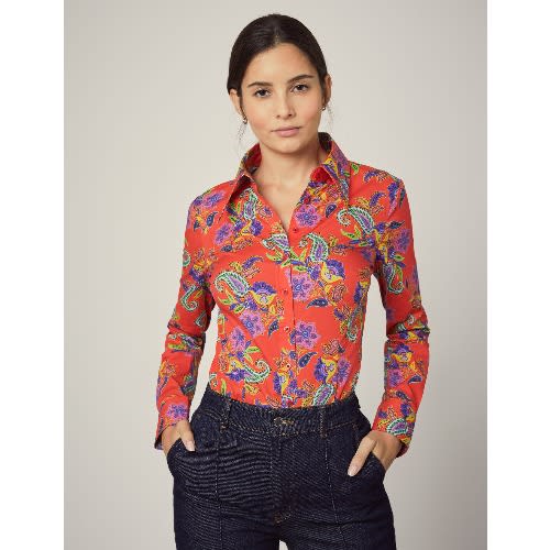 This women's blue and yellow floral print cotton stretch fitted shirt is designed with an elegant single button collar and single cuffs. It is crafted from high quality cotton stretch fabric which stops the shirt from feeling restricting. Finer details include fuss-free single cuffs and a contrasting trim inside the collar. Our fitted shirts have been flatteringly designed with darts at the waist and bust, creating a streamlined silhouette.