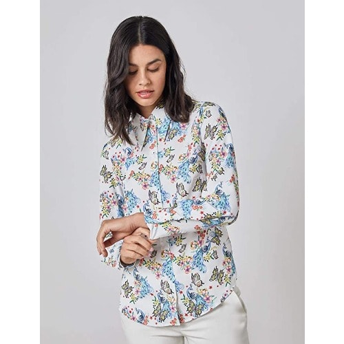 Overszied female blouse in silk floral print fabric, v-shaped opening at front, long, raglan ballon sleeves with elasticized cuffs and elastic at the back.