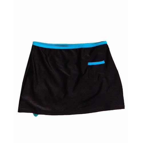 Girls black swim skirt, ideal for any little girl that likes or swim or perfect lightweight for summer. Black fully elasticated waist swim skirt. Featuring blue trimmings to waistband and blue trim to top of one pocket.