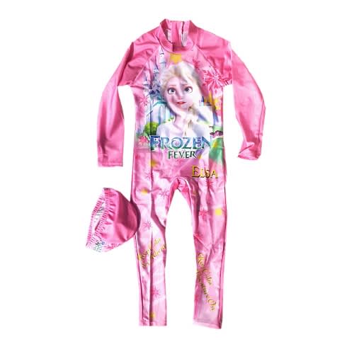 This is full body cover suit for swimming.It has long sleeve with round neck .It is decorated with Frozen characters that children love.It gives full protection while swimming.It has a short zip at the back .The cap is detachable.The sizes are L,XL,XXL,XXXL AND 4XL.