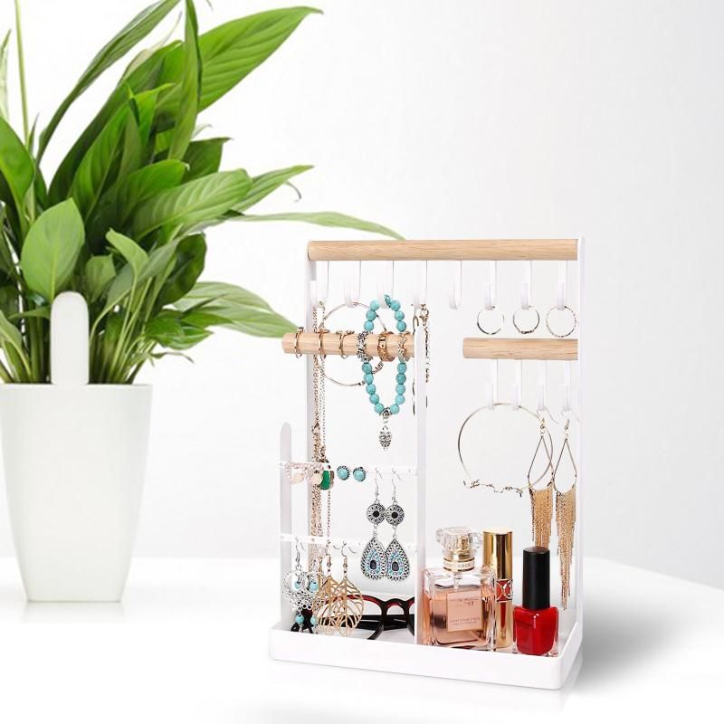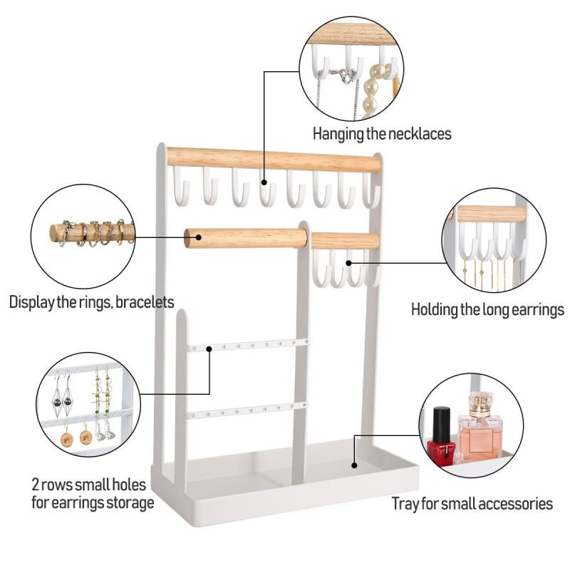 - This unique jewelry display stand can hanging multiple small jewelry items and a tray to store earrings. It assists in saving space on any dresser or bathroom counter.