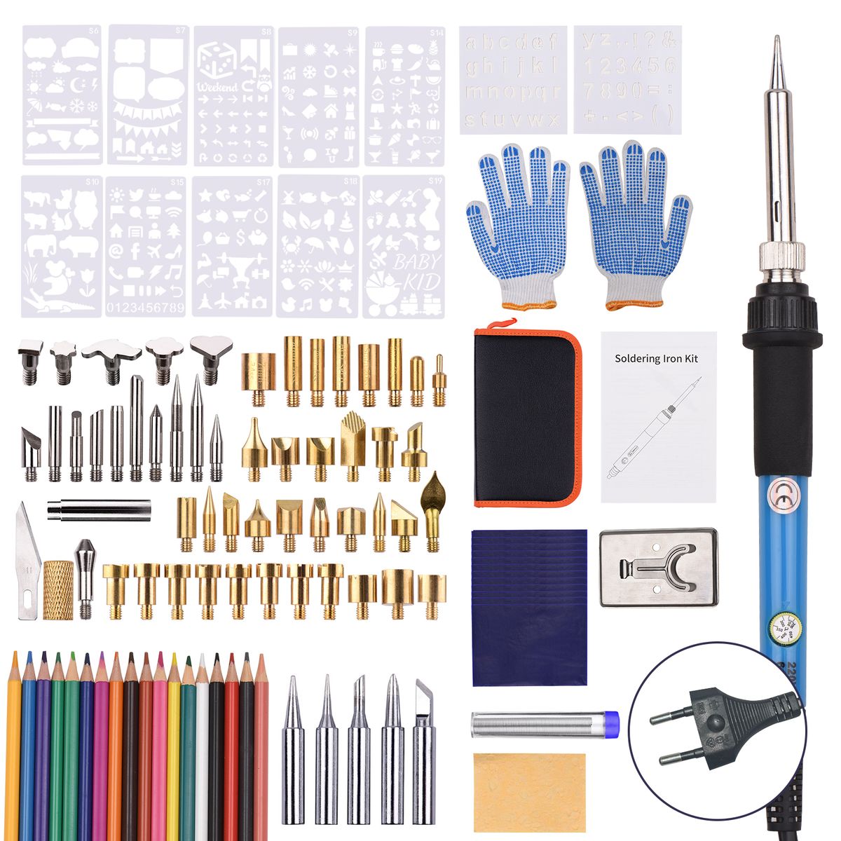 ✒ Professional Pyrography Kit: This 105 pieces wood burning tool kit includes 1 x pyrography pen, 1 x pen holder, 54 x wood burning tip, 5 x iron tip, 7 x stencil, 5 x wood board, 12 x carbon paper, 18 x colored pencil, 1 x tin wire, 1 x gloves, 1 x sponge pieces, 1 x storage bag.