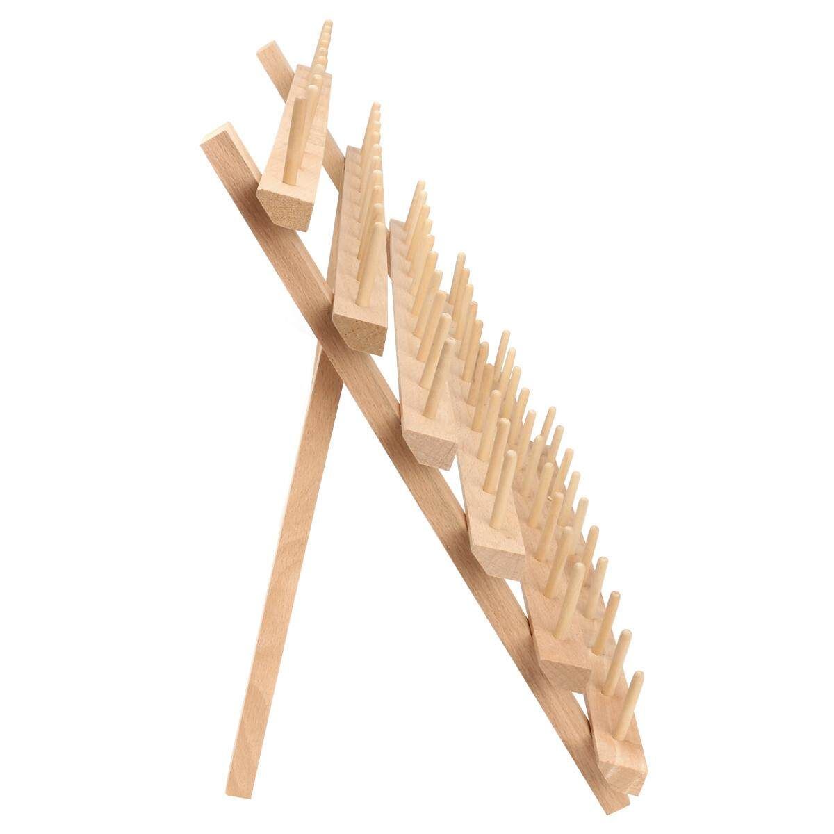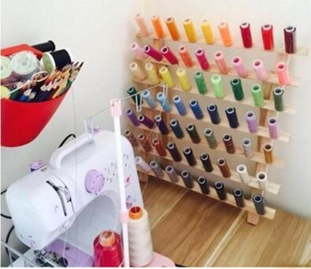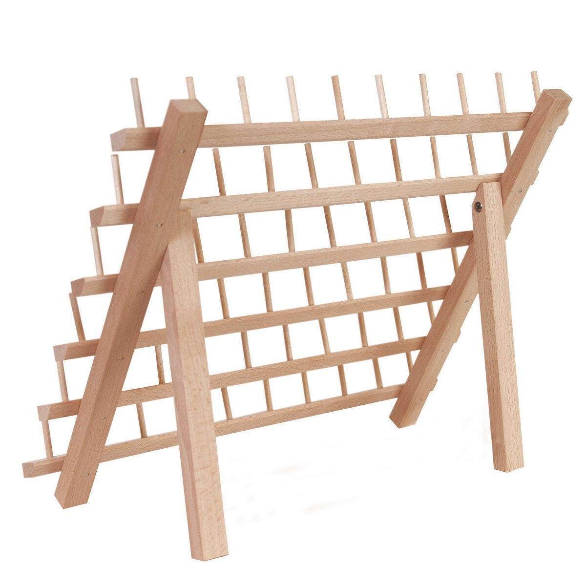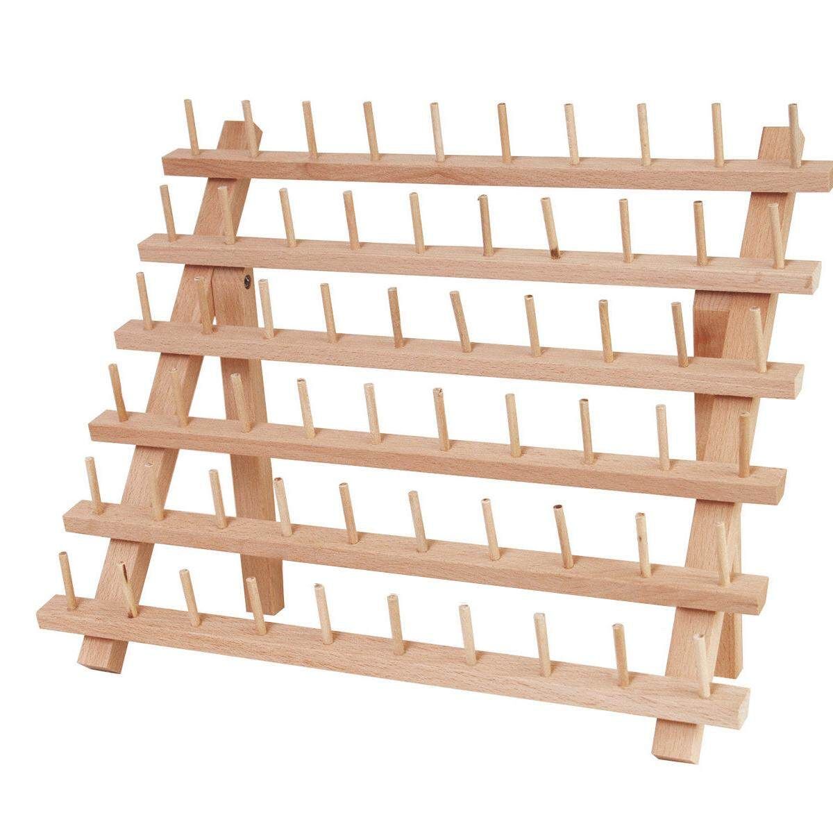 Package included: 1 x Thread Rack (Not including the threads) Feature: *60-Spool Thread Rack for Holding Sewing, Quilting, Embroidery Spools and most Cones *Can be painted or stained to match with any room decoration. *Flip-out legs to be freestanding on a table or can be hung on a wall. *Durable natural wood, can be stained or painted.