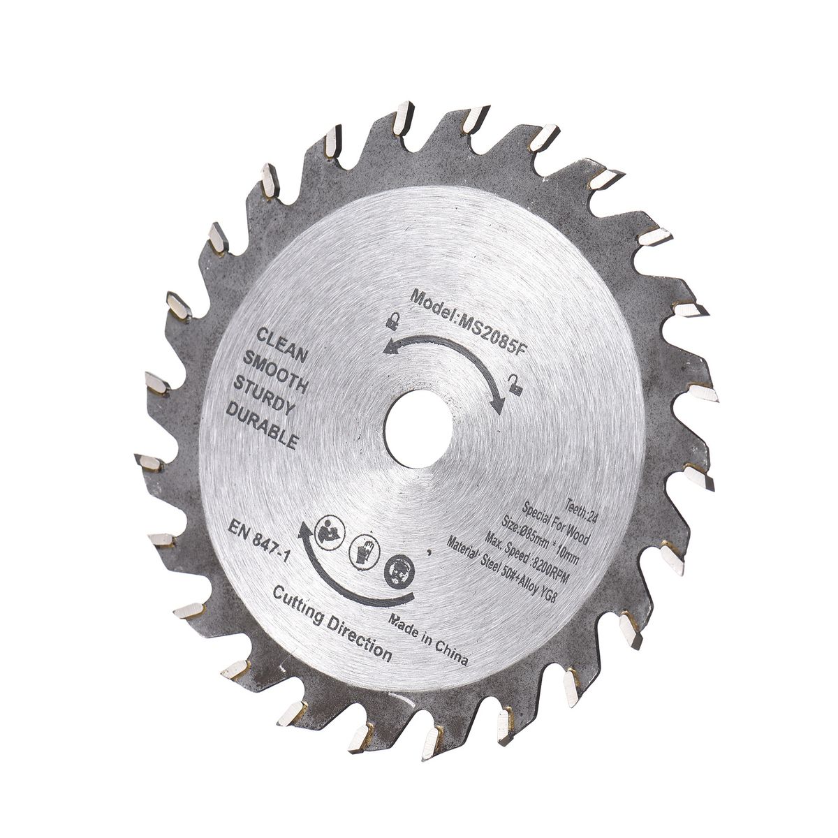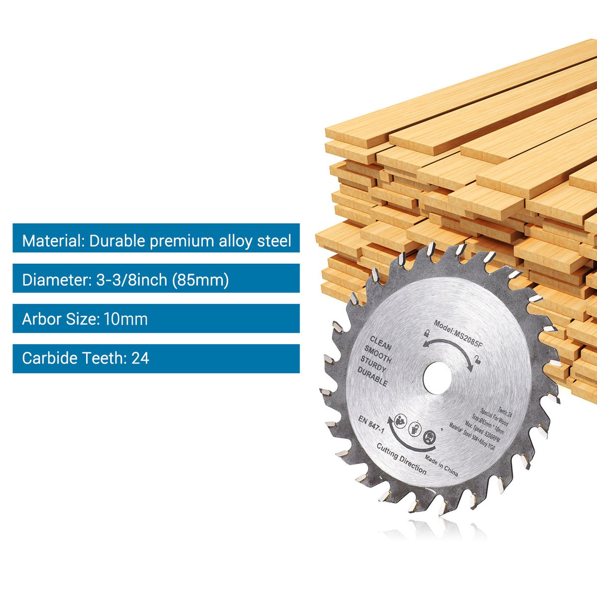 The cutting has 85mm (3-3/8inch) diameter, 10mm arbor size, and 24 carbide teeth, which applicable to model of 3-3/8" 85mm mini circular (76601L).