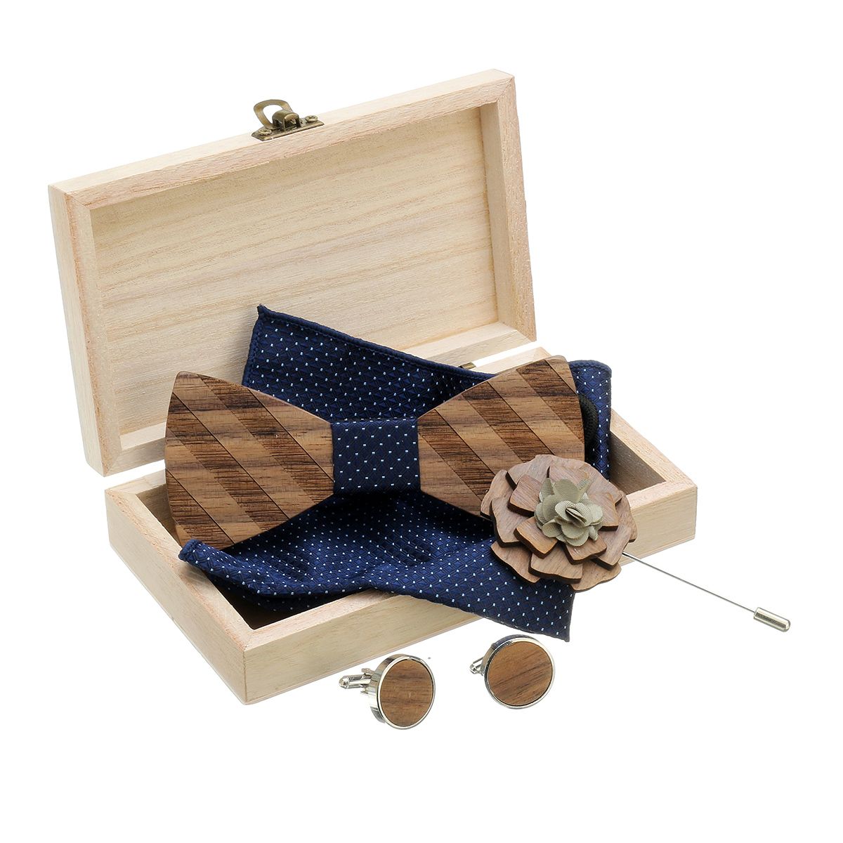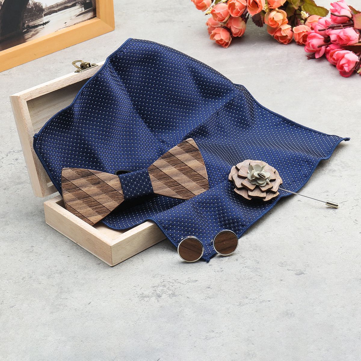 1. 4-in-1. Handmade Walnut wood Bowtie, handkerchief, cufflinks and brooch with Gift Box.