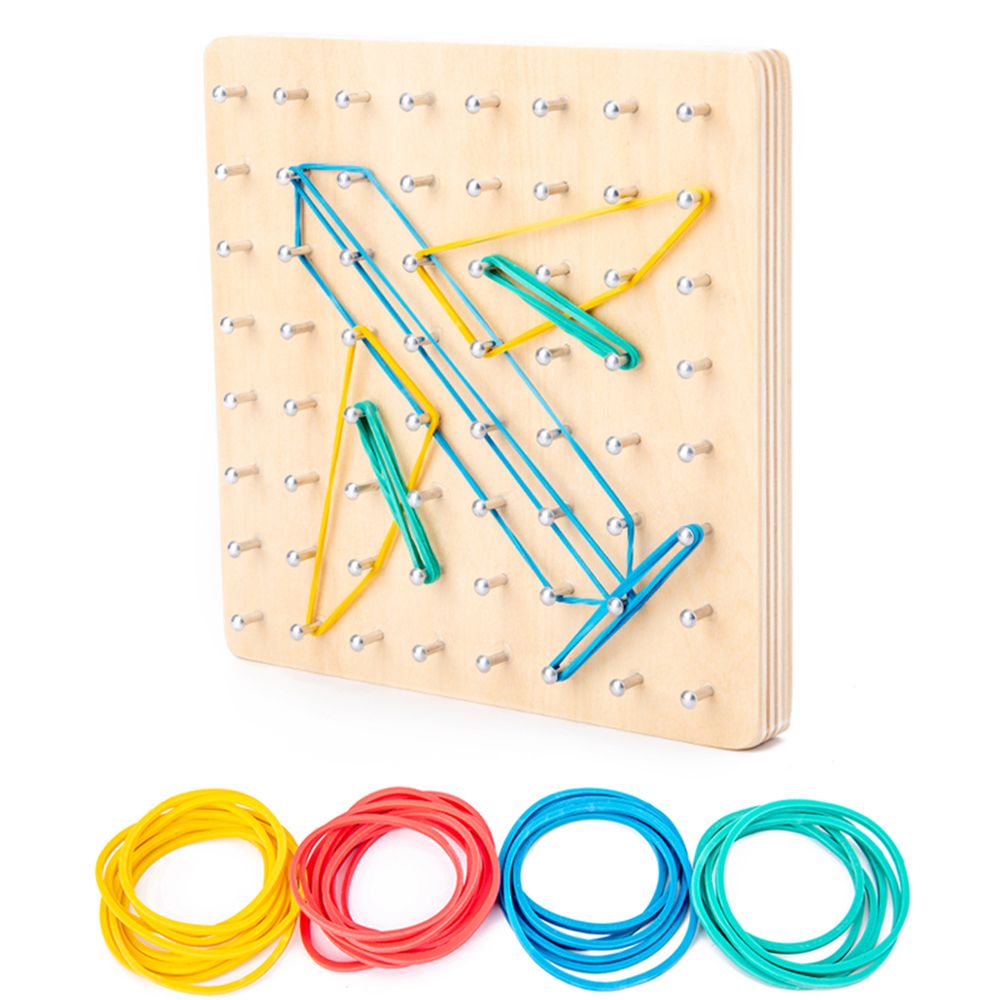 Wooden geoboard with colorful rubber bands and geometic cards, perfect educational toy for promoting kids\' imagination!