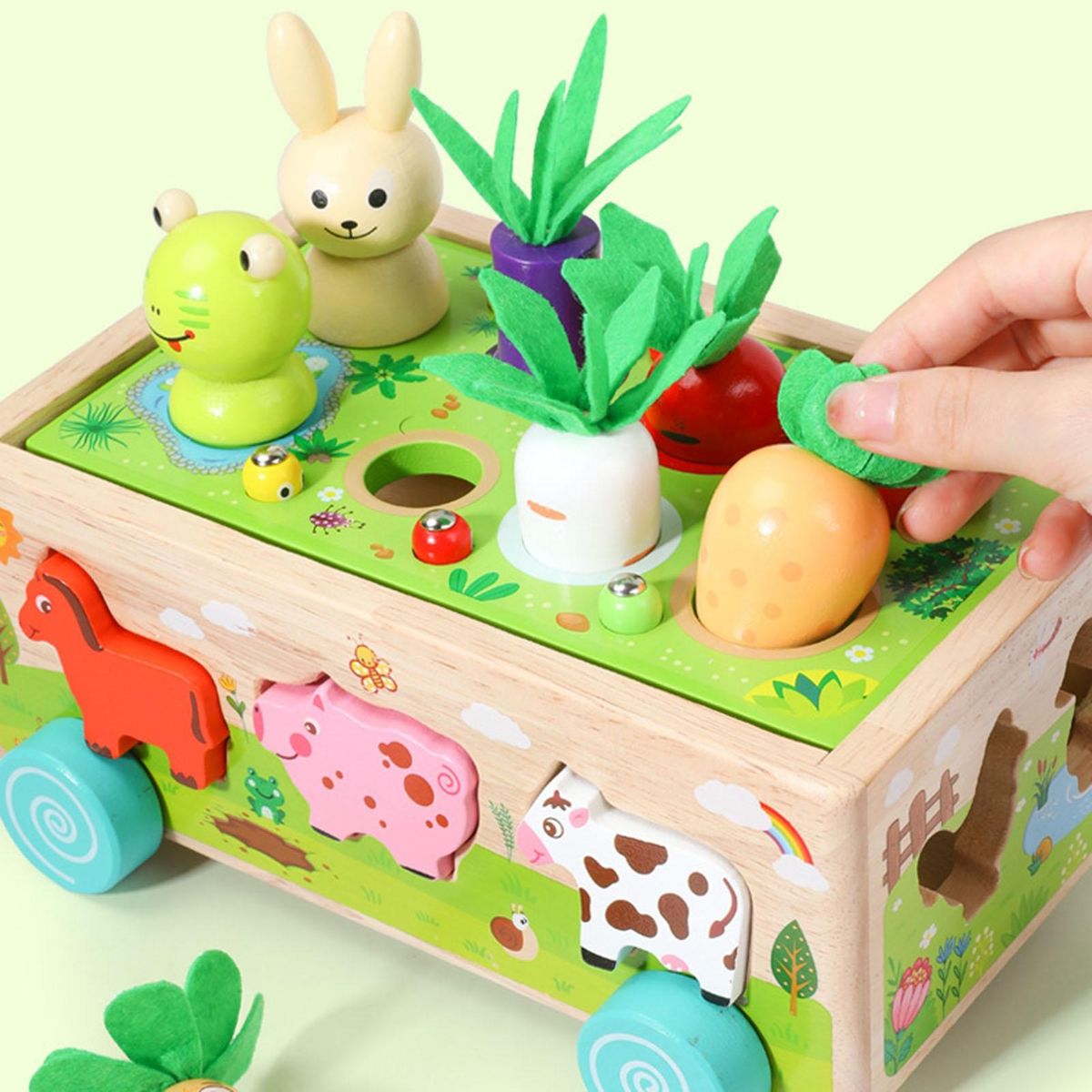 This learning toy features a farm animal car, radish pulling toy, and shape recognition matching intelligence car, providing endless fun and learning opportunities. the matching blocks help toddlers identify different shapes and colors as they sort and assign the blocks. this not only enhances their cognitive skills but also promotes hand-eye coordination and problem-solving abilities.