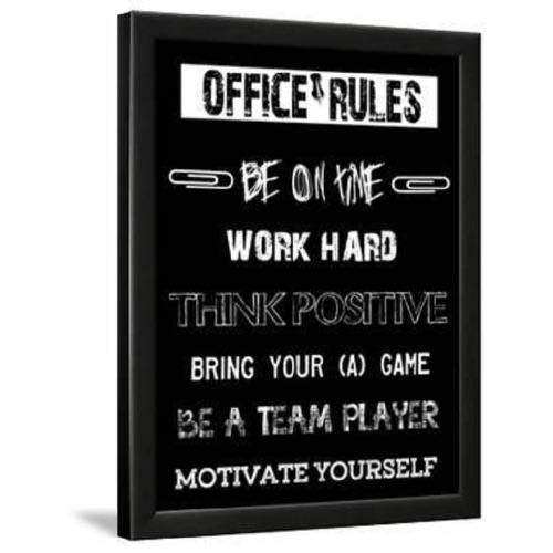 A must have for every office. Hanging office rules is a reminder of the work ethics,quality and standard to always maintain and attain. Keep the office competitive with the constant hanging office rule board Dimensions (width x height): 13" x 19" This art print displays sharp, vivid images with a high degree of color accuracy. A member of the versatile family of art prints, this high-quality reproduction represents the best of both worlds: quality and affordability.