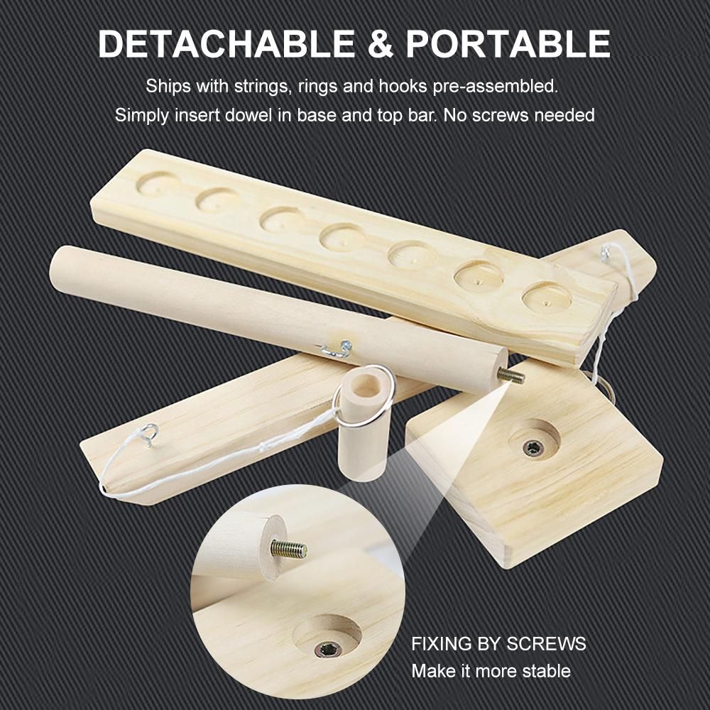 Ships with strings, rings and hooks pre-assembled. Simply insert dowel in base and top bar. No screws needed.