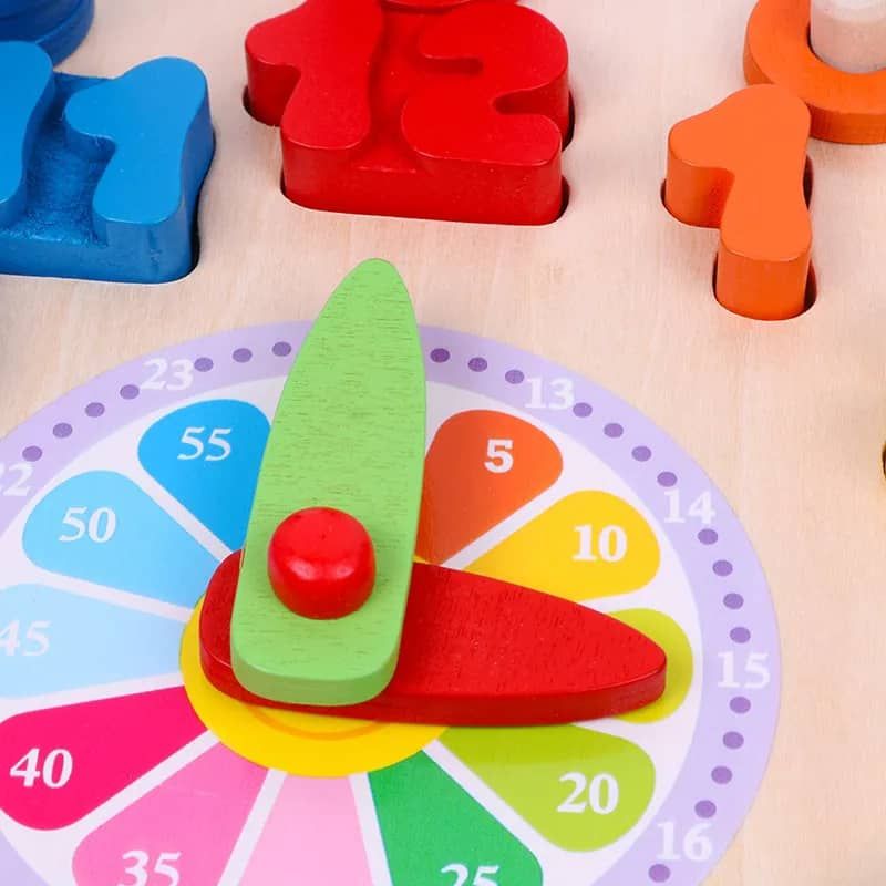 educational toy that helps kids tell the time. The clock comes with number and round blocks that fit into the slots on the clock face. The blocks are made of solid wood and painted with bright colours. This toy also helps kids develop their fine motor skills, cognitive skills, and creativity.Material: Wood Colour as pictured Recommended for children 3 years and olderPerfect Kids Gifts: This wooden learning clock helps kids learn to tell time, count numbers, and recognize colours. It's a great gift for Thanksgiving, Halloween, Christmas, birthdays, and travel. Number and Round Blocks: This wooden clock comes with 12 colourful blocks that have numbers and shapes on them. Kids can learn numbers, distinguish colours, and know shapes while playing with the blocks. The blocks also improve their hand-eye coordination and fine motor skills. Easy Detaching: This learning clock is not only detachable and easy to use, but also durable and safe. It is made of solid wood with harmless paint and fine workmanship, so it won't damage easily. Your kids will love learning with this clock for a long time. Brain Teaser Toys: As kids play with this wooden clock, they develop fine motor skills and basic timing concepts. The clock also provides an interesting game for parent-child interaction, which boosts their mental health. Time Discovery: Kids can experiment with the minute and hour hands on this wooden clock. They can set different times and learn read the clock in different contexts.
