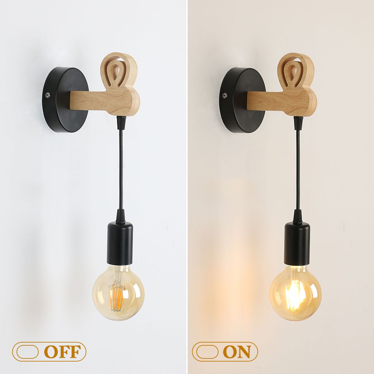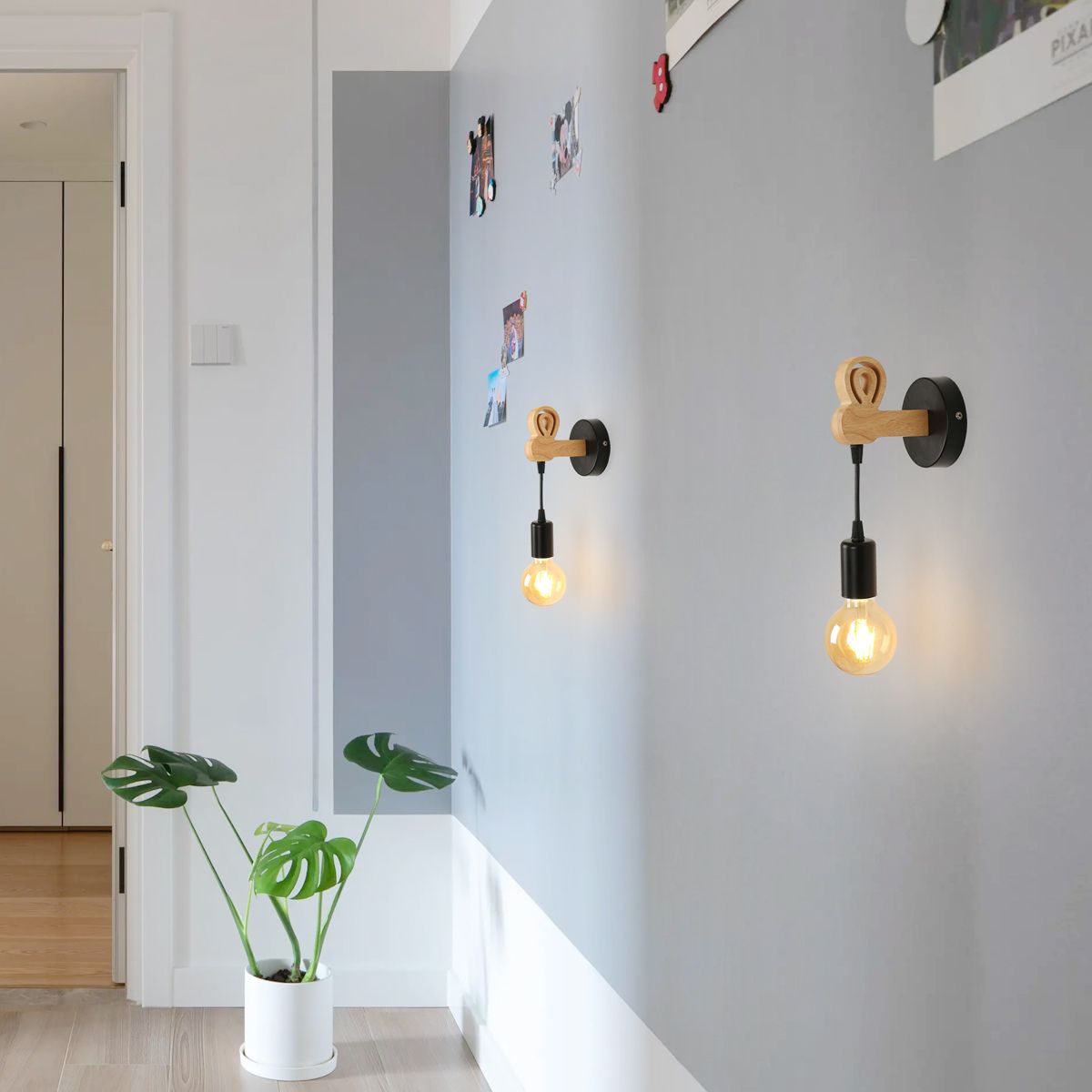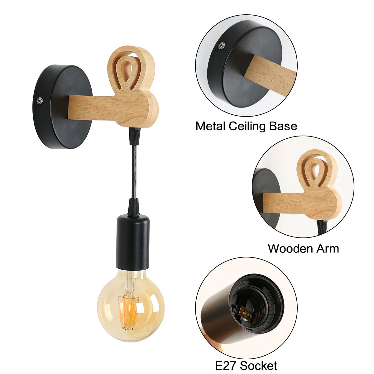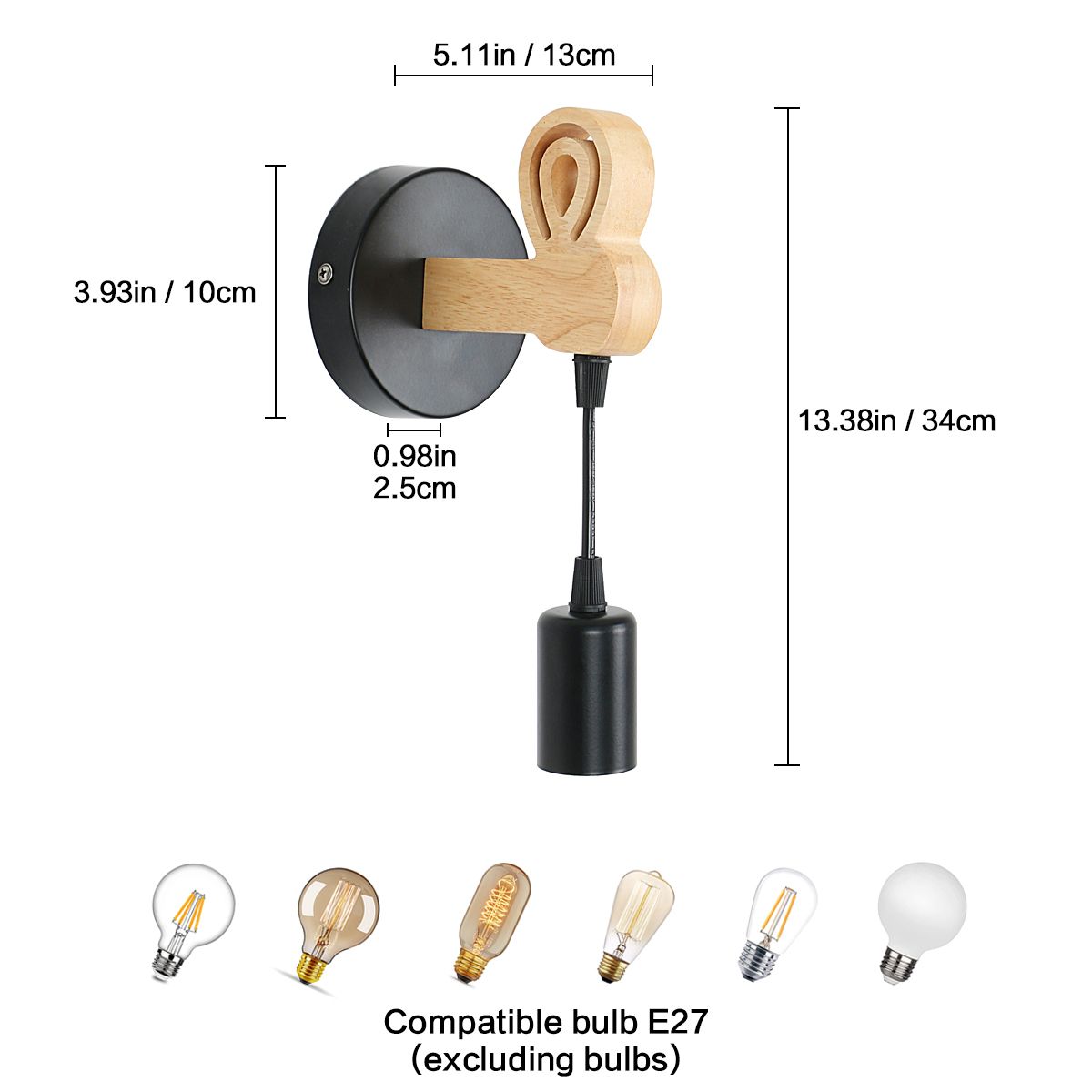 e27: Vintage wall lamp is suitable for different E27 lamps. You can choose bulbs with different color temperatures to add atmosphere to the room according to your needs.Unique design: Black metal housing, beautiful wooden pole, mix modern and vintage styles, coordinate different furniture styles and show your unique taste.Easy to install: Industrial metal and wood wall lamp comes with a convenient installation kit to help you install it quickly. Please turn off the power before installation.Applications lagres: Black indoor wall lighting is especially suitable for kitchen, dining room, living room, porch, attic, porch, industrial place, dining room, cafe, it is the perfect choice for lighting and decorating your home.The iron wall lamp emits a warm white light that can create a warm and romantic atmosphere.When closed, it can also be part of the furniture decoration.SizeWall lamp size: 10 * 13 * 34cm / 3.93 * 5.11 * 13.38 inchesWire: 19cmLength of the wooden arm: 11 cm