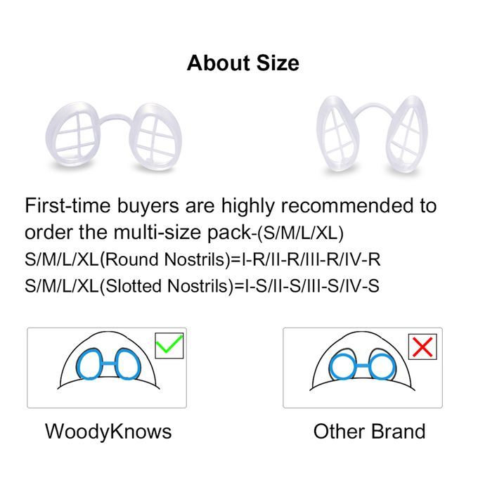 There are two shapes of nasal filters for your choice, round shape and slotted shape. Please choose it according to the shape of your nostrils. The size of nasal cavity is different from size of nose. First-time buyers are highly recommended to order the multi-size.