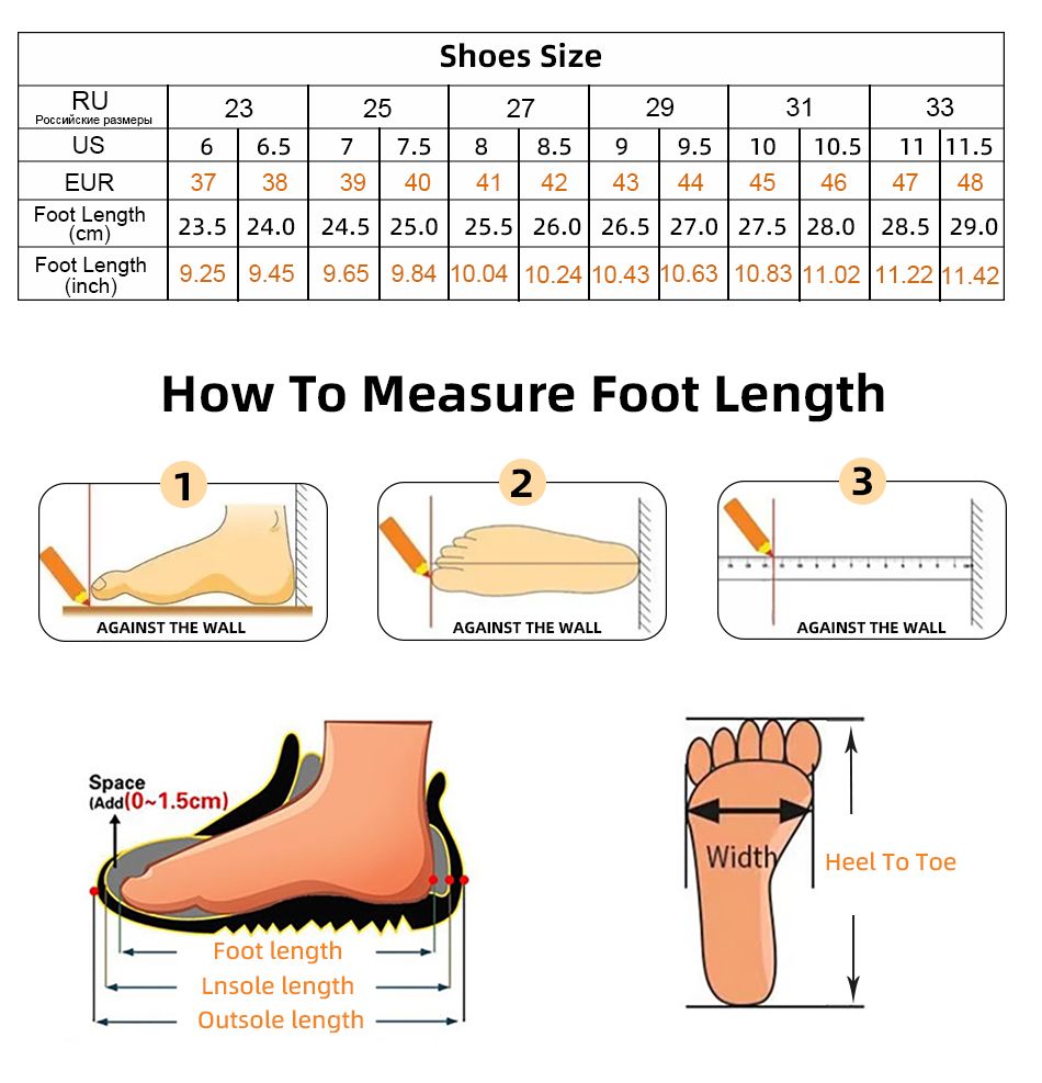 Descriptions1:The Size Of Each Country Is Different, f You Are Not Sure About Your Size, You Can Choose The Real Size According To The Length Of Your Feet.2:When Measuring, Do Not Measure The Length Of The Sole, Measure The Length Of Your Bare Feet. Relax To Keep The Foot Stretched While Measuring.3:Confirm That The Order You Purchased Is Genuine And Included: Shipping Address, Recipient Name, Phone Number And Zip Code.4: If Your Foot Is Bigger Than Standard , Please Choose The Bigger One Size, If Your Foot Is Smaller Than Standard ,Please Choose The Smaller One Size.