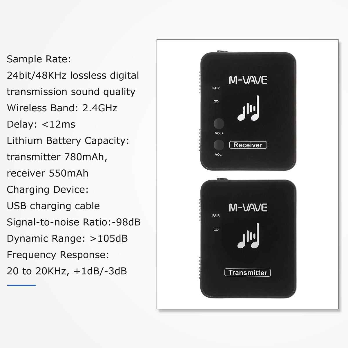 2.4GHz wireless transmission band, 24 bit/48KHz sample rate.