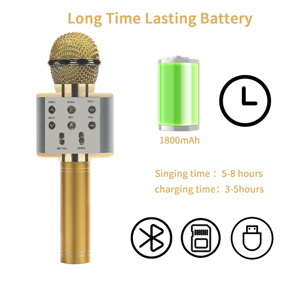 WS858 mikrofon Handheld Bluetooth Wireless Karaoke Microphone Phone Player MIC Speaker Record Music KTV Microfone ws 858 Note:we will check every one good condition before we send,so do not worry the quality. pls contact us if you have any question when you receive your order.do not leave the bad rates.thanks. Features: --Portable and durable, lightweight, easy to carry --Bluetooth technology for lower energy consumption but more stable connection and faster transmits speed, effective wireless operating distance is up to about 10m. --Metal shell protective and super bass loss-less sound create a high-quality listening experience. --Noise cancellation function wireless capacitive microphone, you can enjoy singing wonderful music by yourself. --Bluetooth wireless design for connecting to any Bluetooth enabled smart devices. --Distortion is less than 0.5 percent, reduce the loss of sound quality effectively. --It also can recording with mobile phone, connect the recording wire and open the Karaoke software in the mobile phone, then you can record the song and save it. --Suitable for picnic trips, party, family entertainment, singing karaoke, etc.. --Compatible with Most mobile phones and tablets.