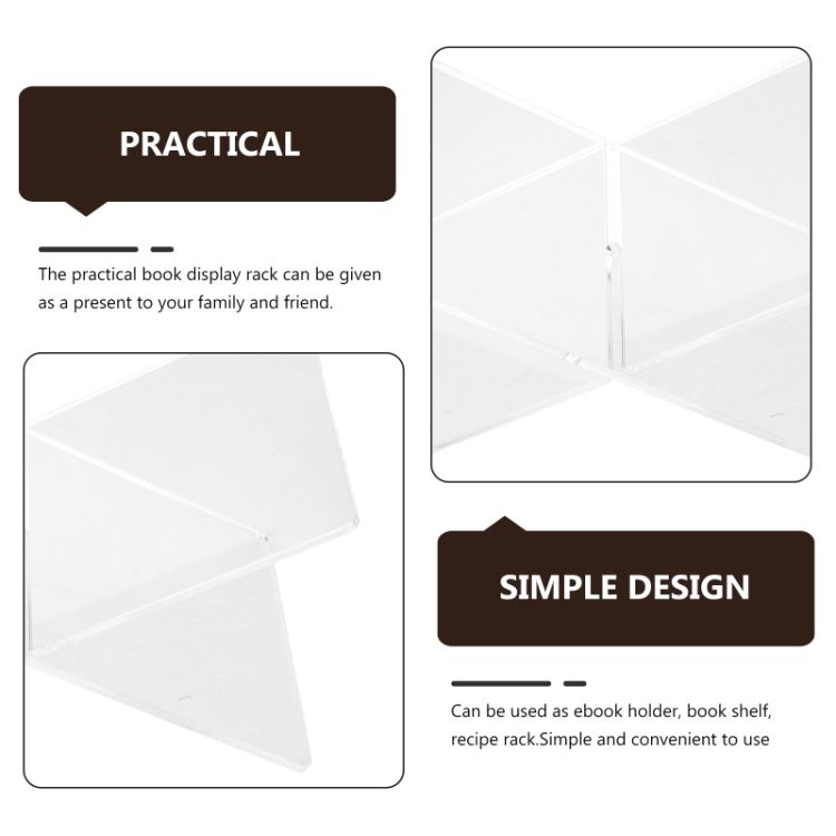 1. Two pieces of acrylic are combined into a set, which is used to display reading books, photo albums, music scores, etc. on the desktop. It can also display books, picture books, picture albums, notebooks, etc. in the bookstore library and other scenes, or display promotional albums in shopping malls or other suitable items.