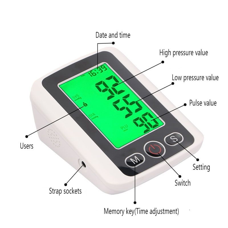 1.Measure the arm joints 2. Easy to operate 3. Automated measurement 4. Storage memory 99 group 5. Query the memory data in sequence 6.LCD HD display 7. The operation is automatically turned off for 1 minute without operation 8. Accuracy: blood preure ± 3% heart rate ± 5% 9.Measuring range: blood preure 0 ~ 280mmHg pulse 40 ~ 199 times / minute 10. English voice
