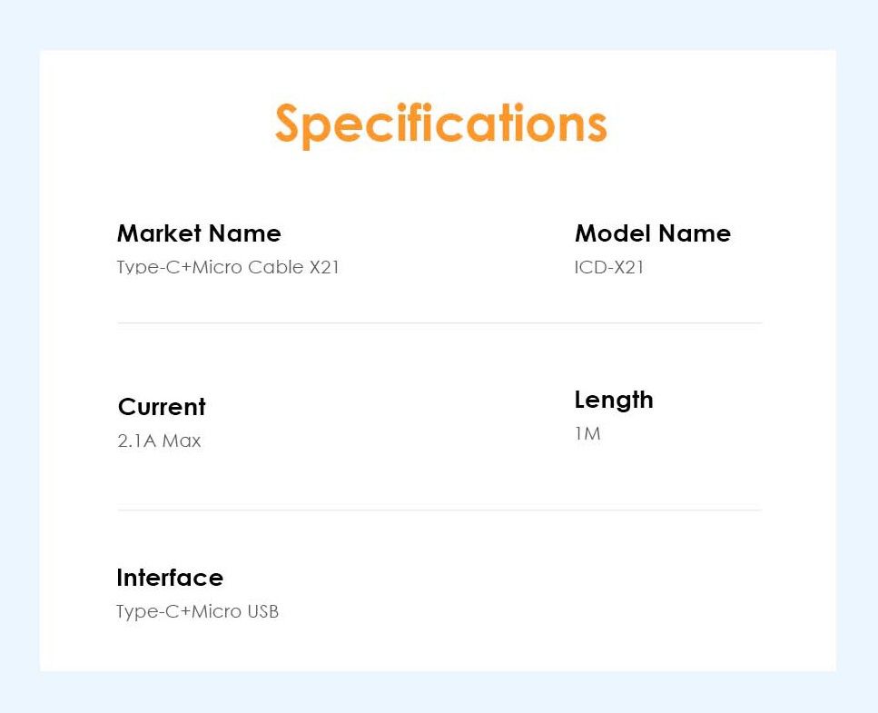 Type: Micro USB & Micro-USB Output: 5V, 2.1ALength: 1M