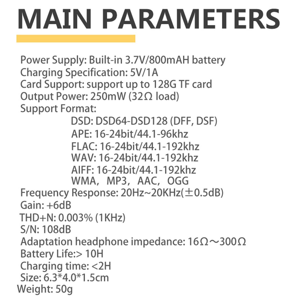 with small size, lightweight, stylish appearance, and good sound quality. It supports many popular lossless audio formats and can support up to 24Bit/192KHz high-definition sampling rate, and support up to DSD128. Considering the increasing volume of current lossless audio sources, this device can support up to 128GB TF card (NOT included), with no need to worry about storage capacity.